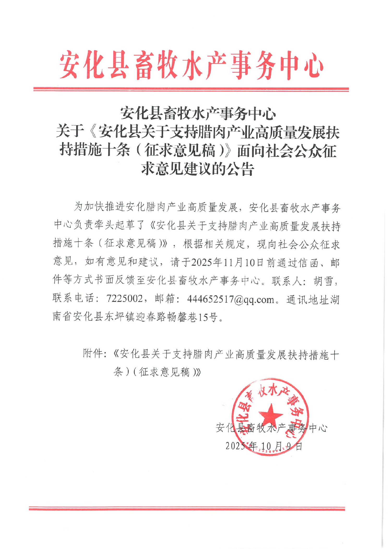 关于《安化县关于支持腊肉产业高质量发展扶持措施十条(征求意见稿)》面向社会公众征求意见建议的公告