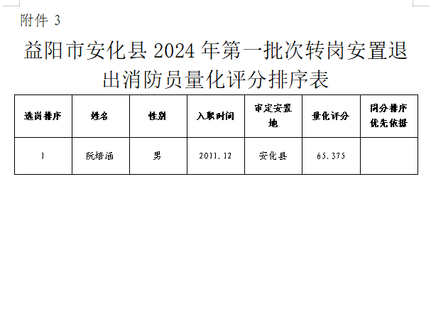 3.益阳市安化县2024年第一批次转岗安置退出消防员量化评分排序表