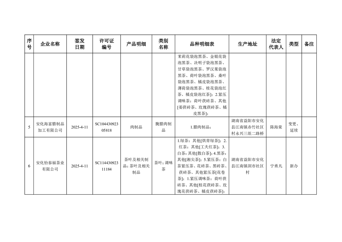 安化县市场监督管理局 2025年第4期《食品生产许可证》核发/变更/延续公告