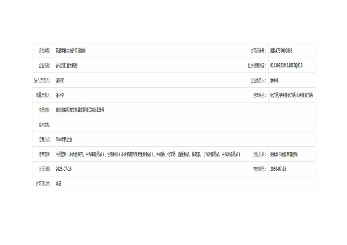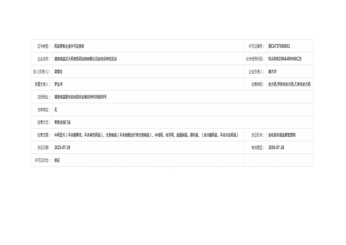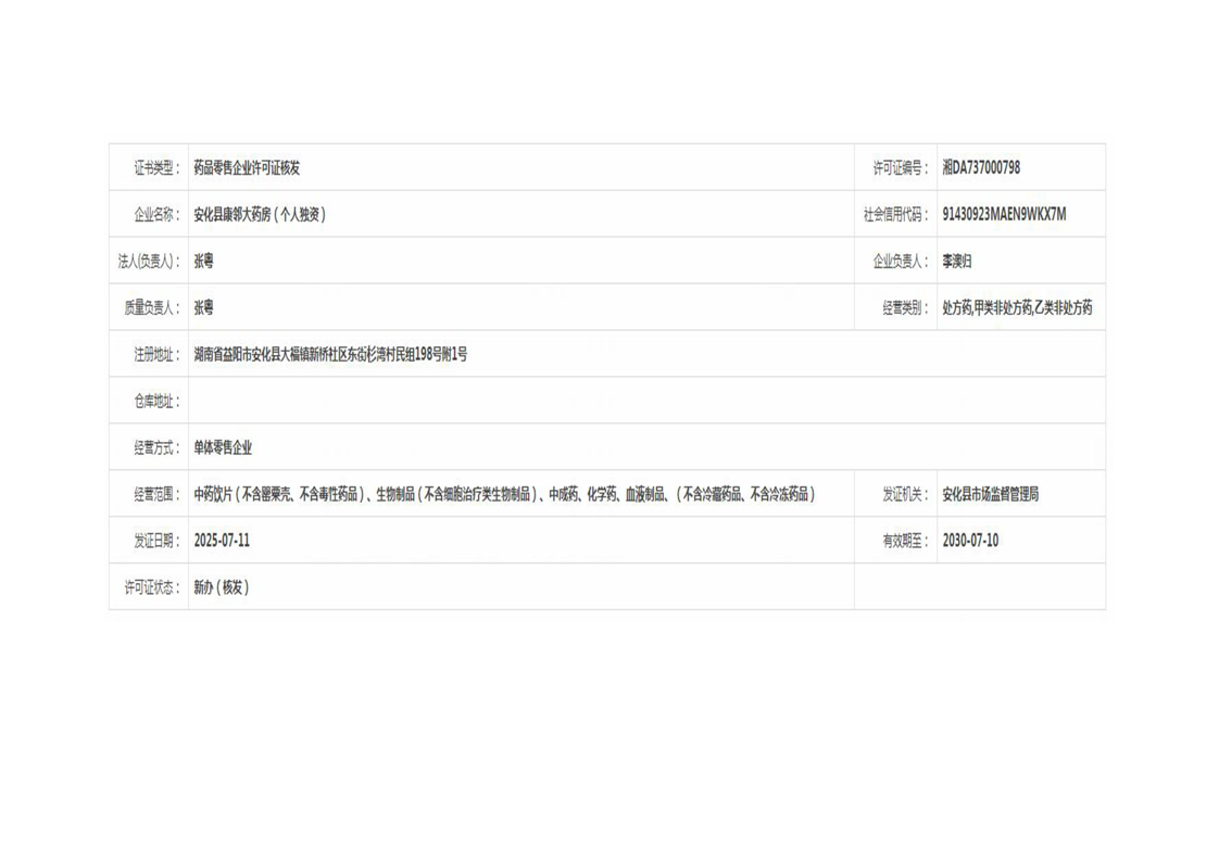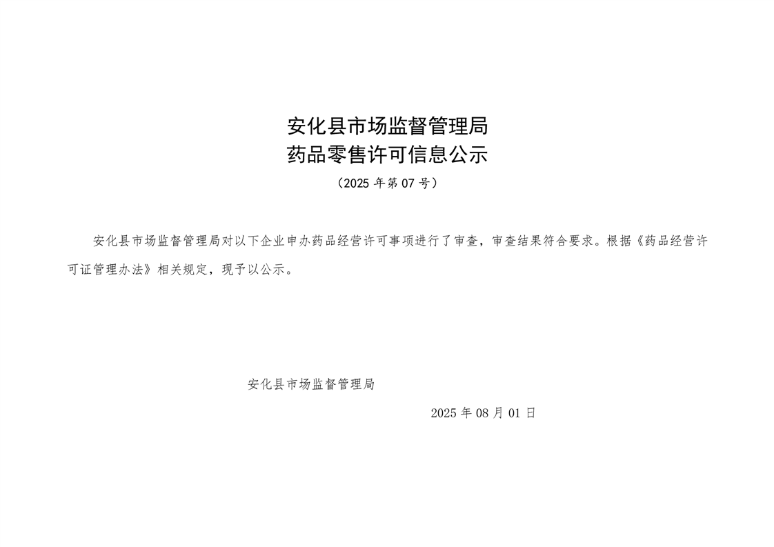 安化县市场监督管理局 药品零售许可信息公示 (2025年第07号)