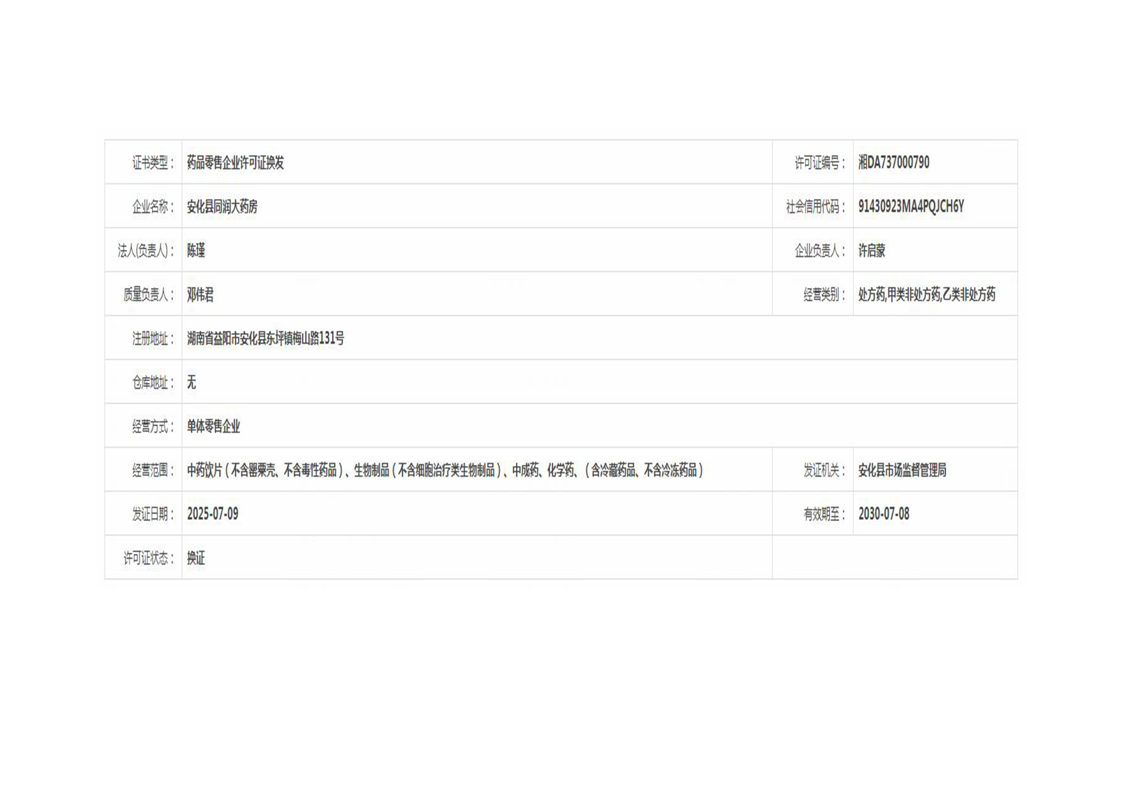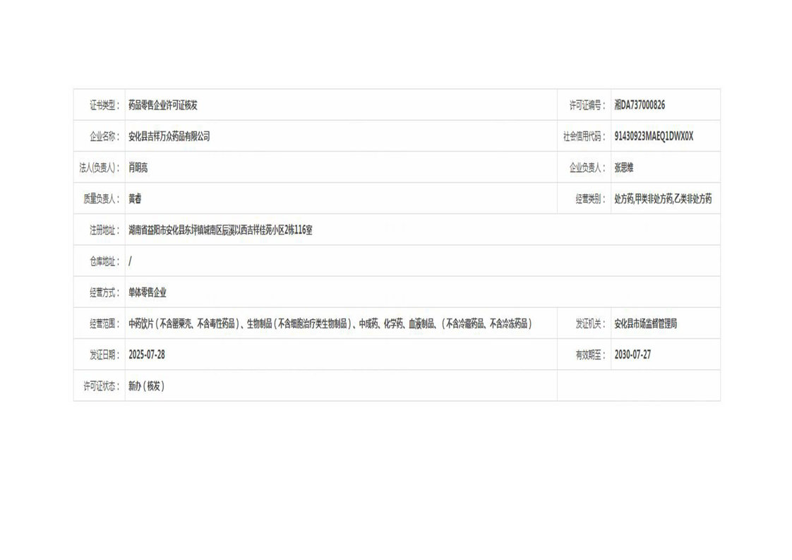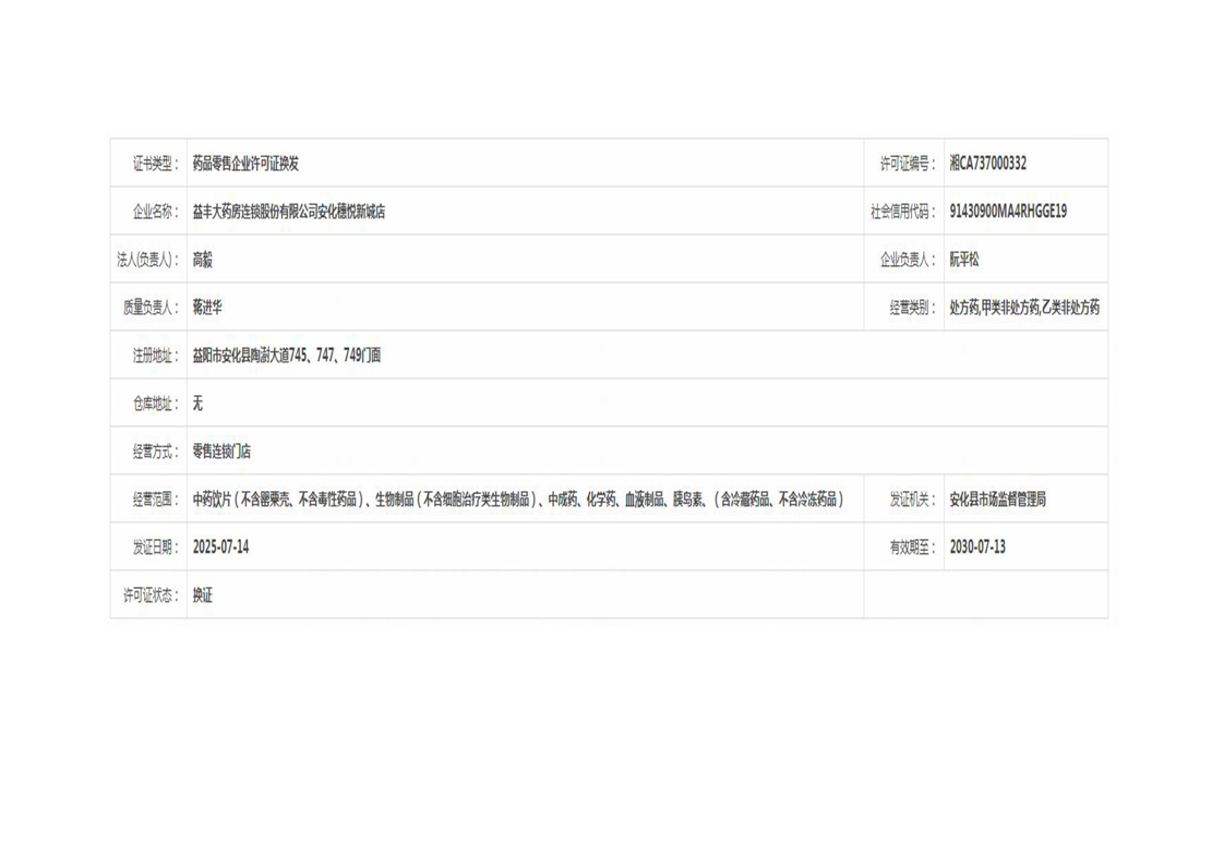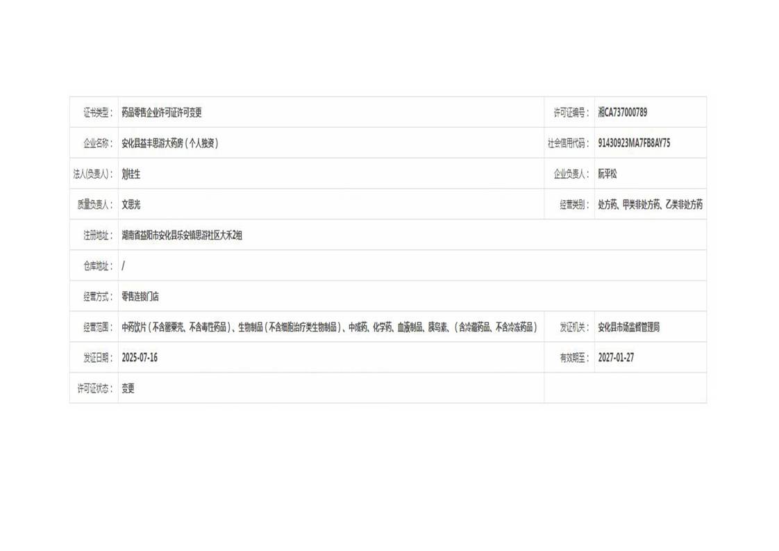 安化县市场监督管理局 药品零售许可信息公示 (2025年第07号)