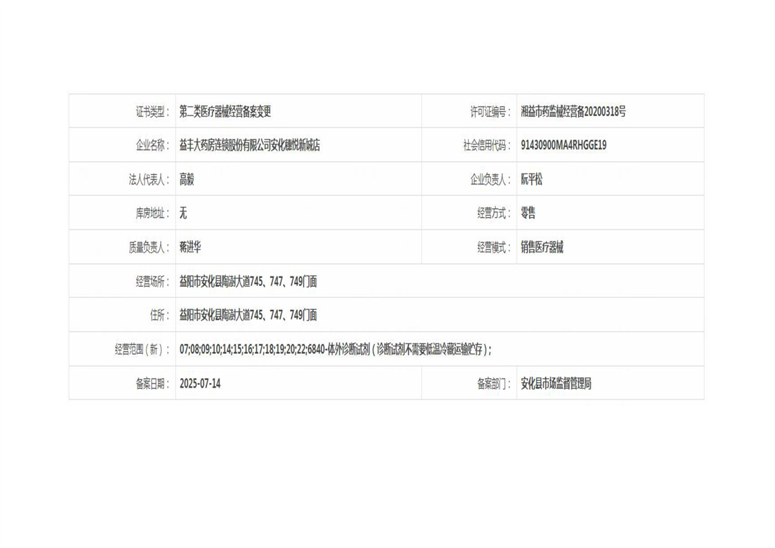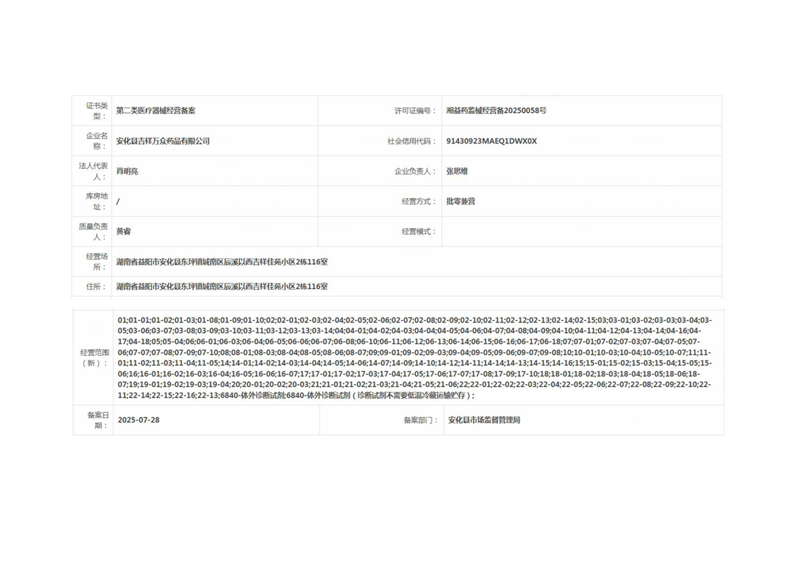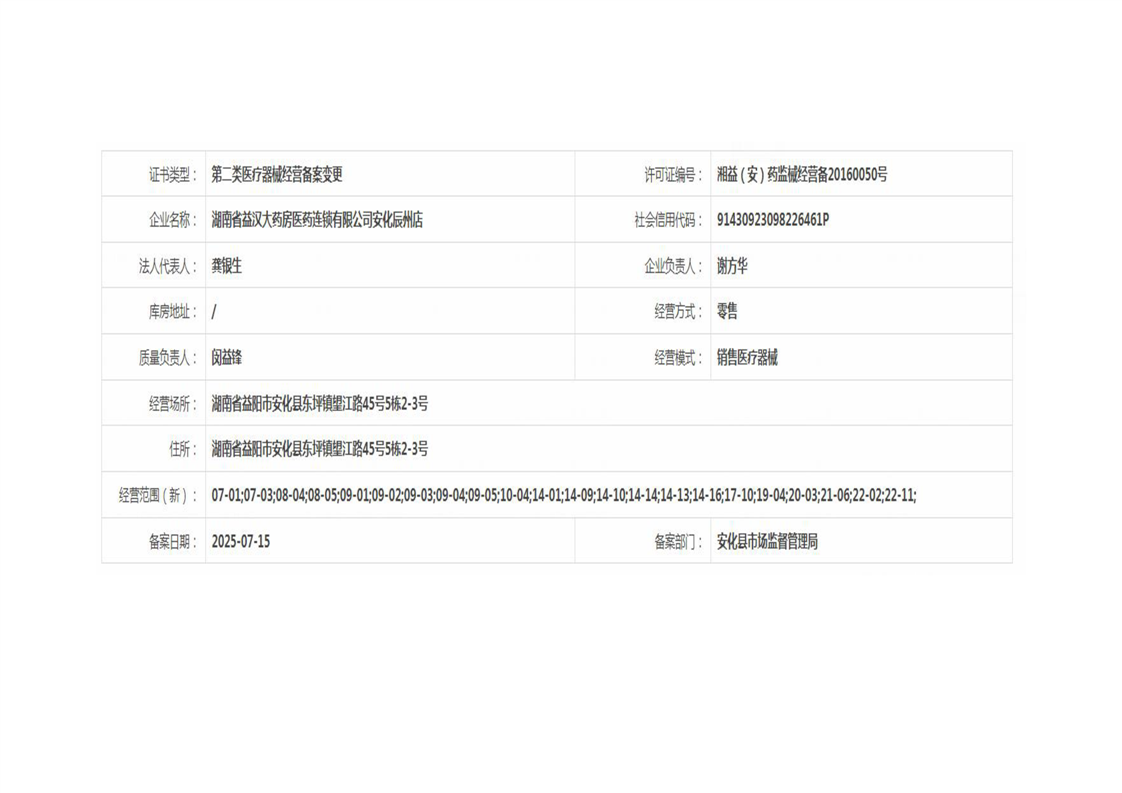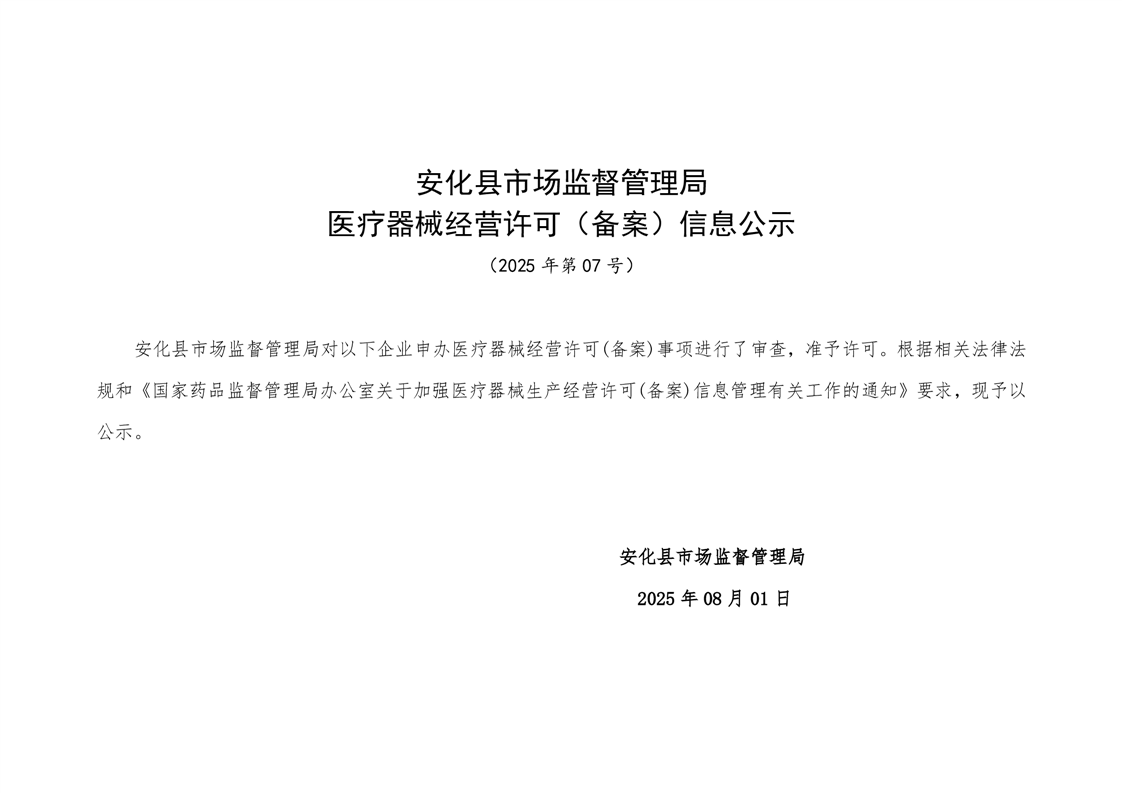 安化县市场监督管理局 医疗器械经营许可(备案)信息公示 (2025年第07号)