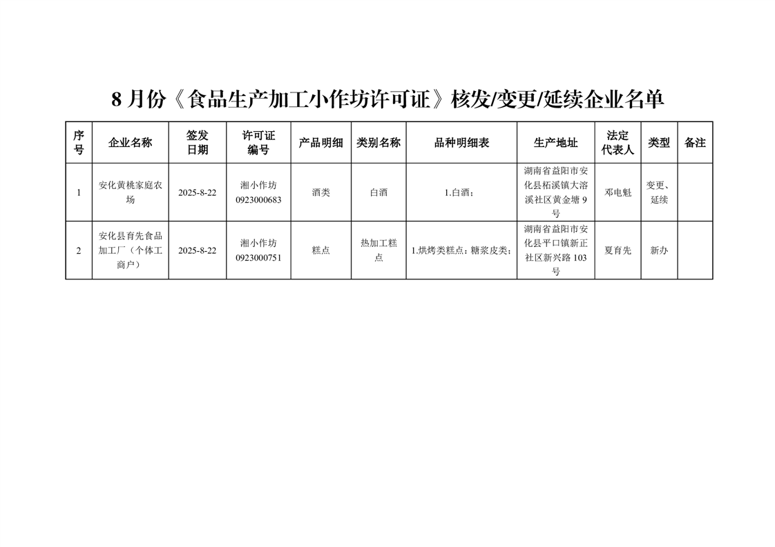 安化县市场监督管理局 2025年第8期《食品生产加工小作坊许可证》 核发/变更/延续公告