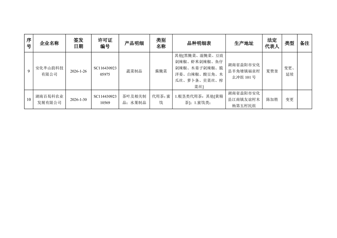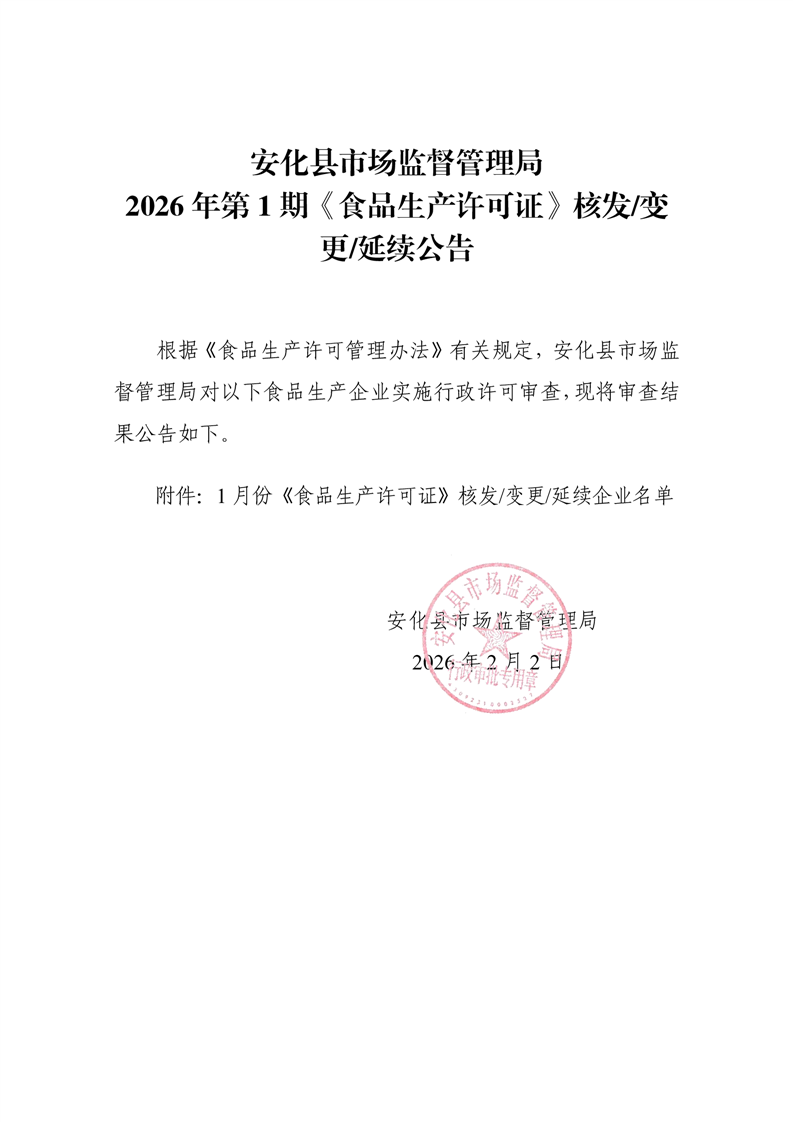 安化县市场监督管理局 2026年第1期《食品生产许可证》核发/变更/延续公告