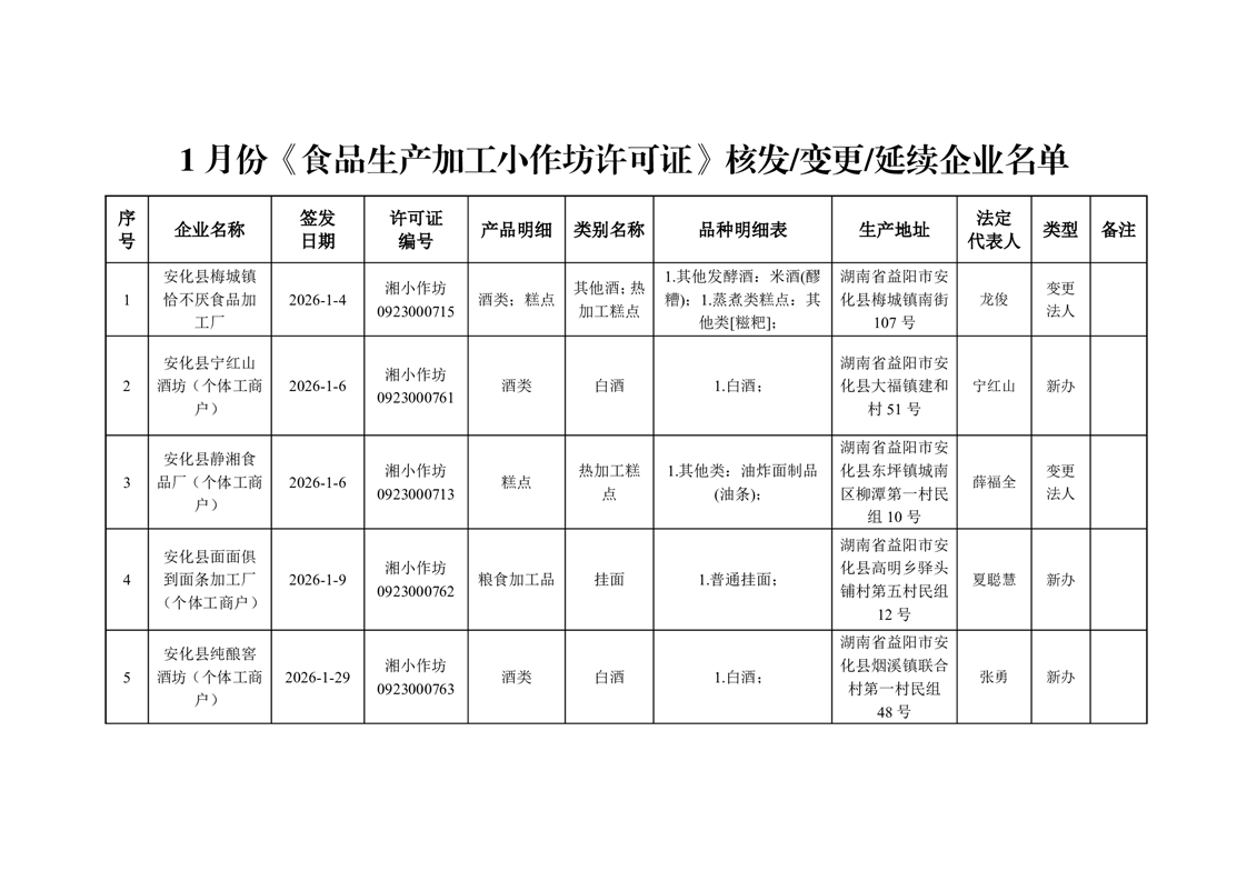 安化县市场监督管理局 2026年第1期《食品生产加工小作坊许可证》 核发/变更/延续公告