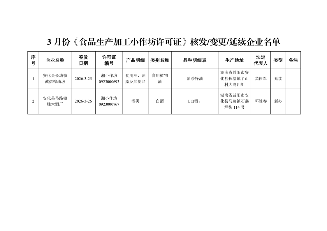 安化县市场监督管理局 2026年第3期《食品生产加工小作坊许可证》 核发/变更/延续公告