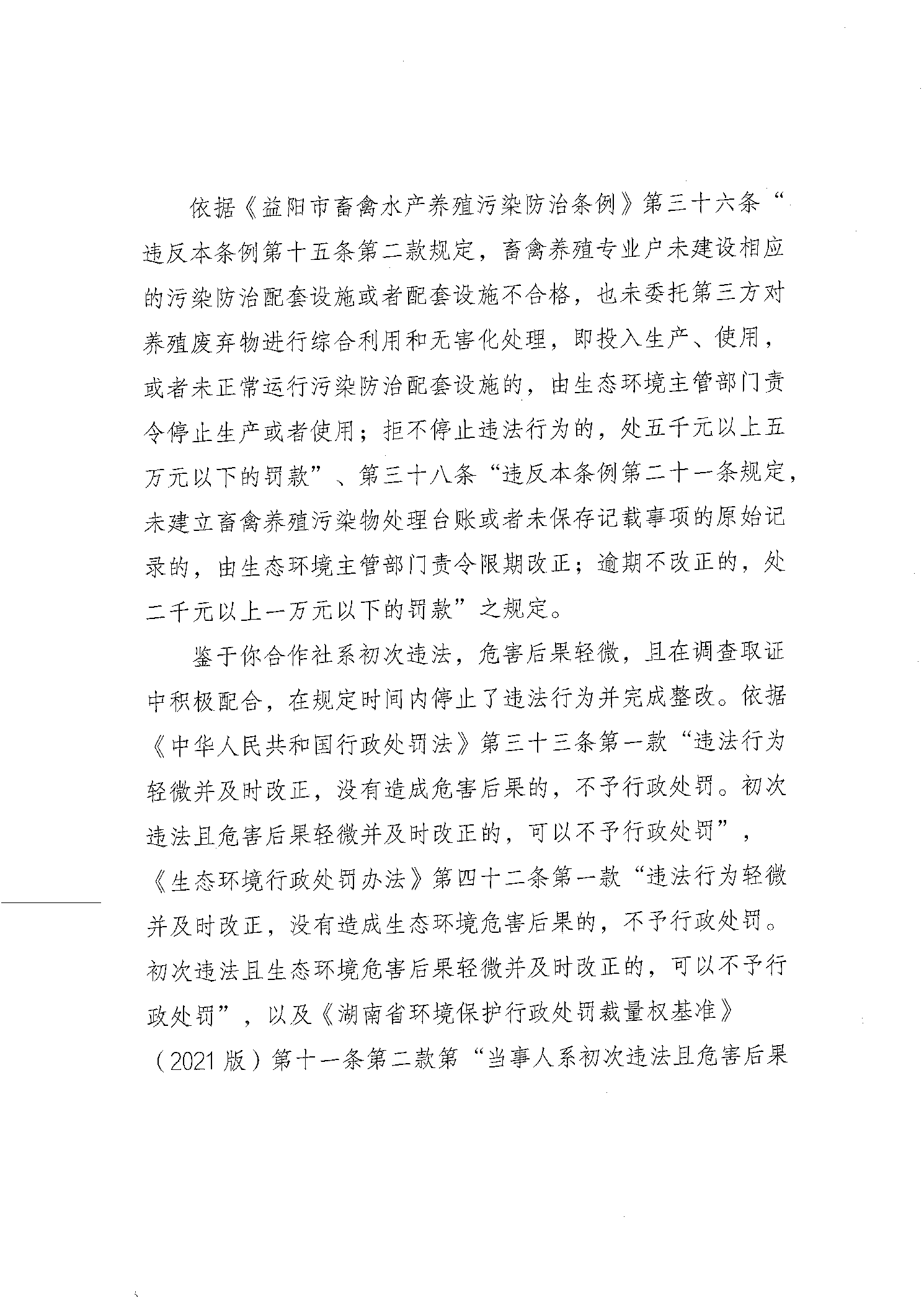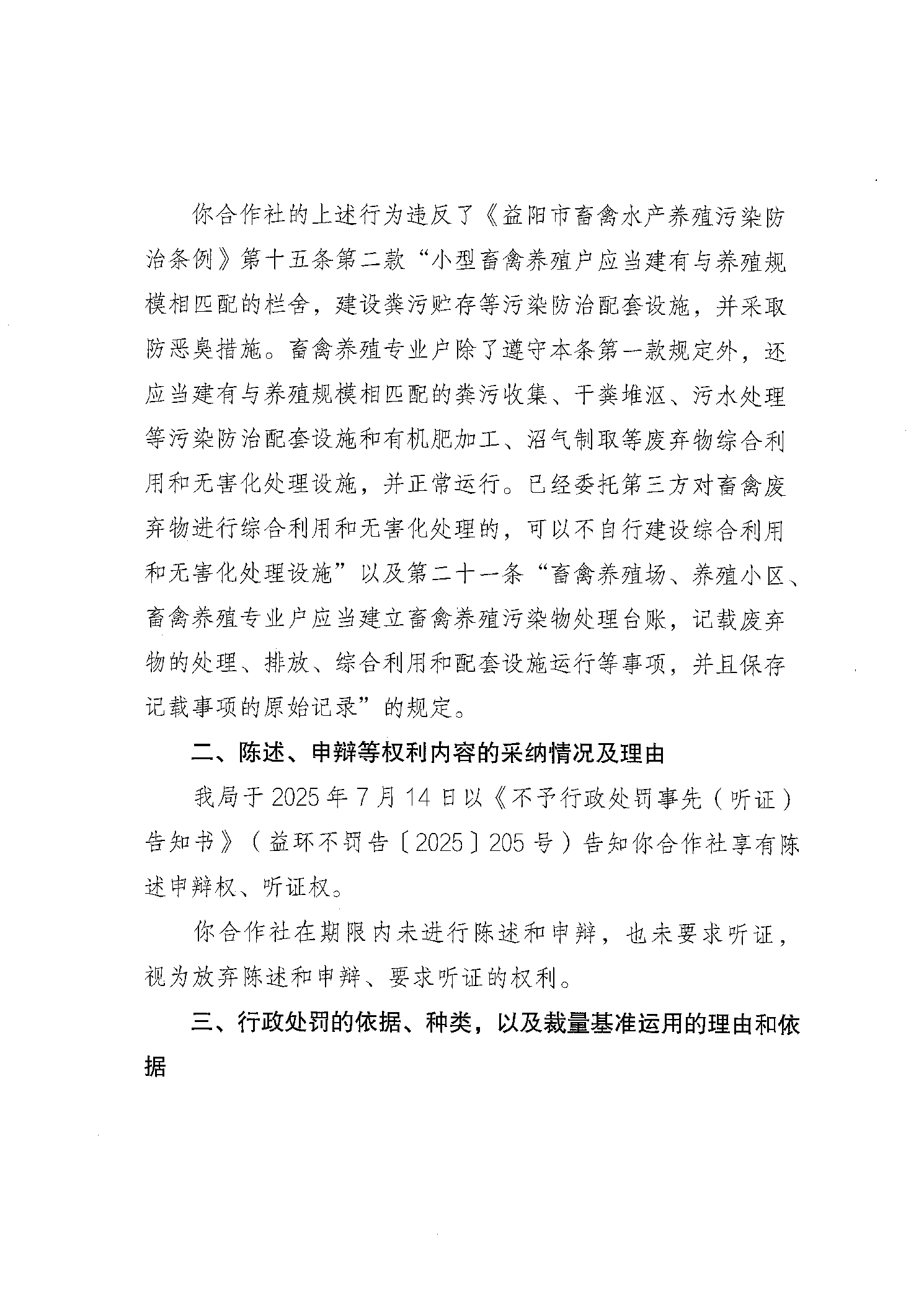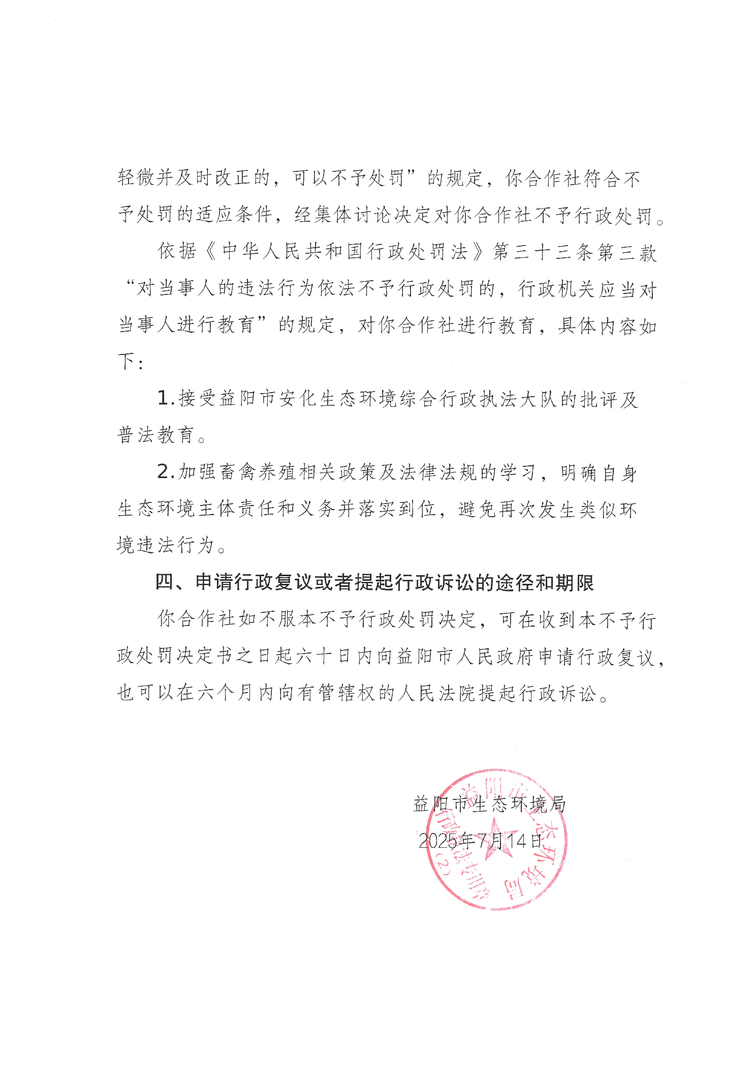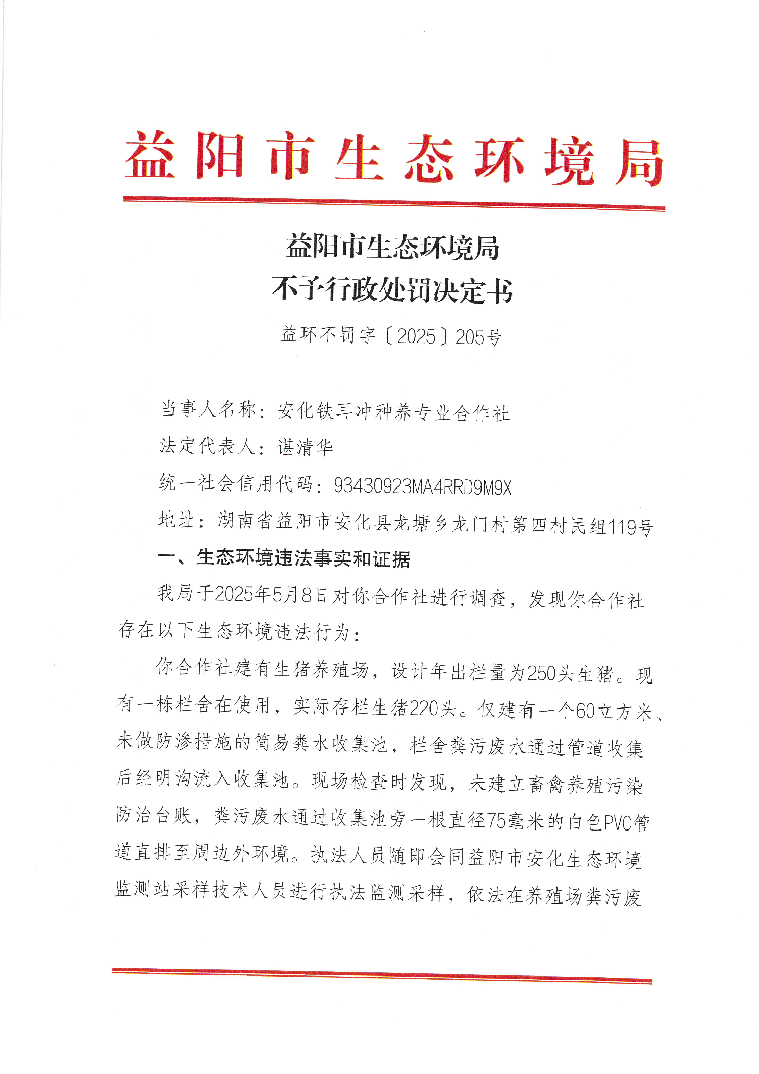 不予行政处罚决定书 益环不罚字【2025】205号 安化铁耳冲种养专业合作社
