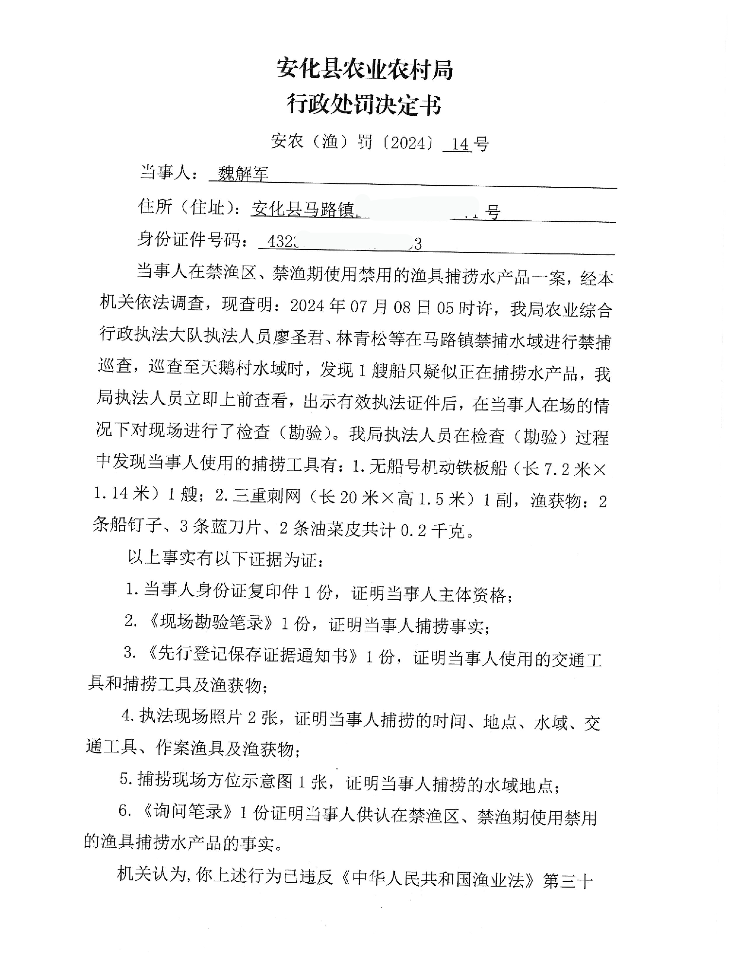 魏解军在禁渔区、禁渔期使用禁用的渔具捕捞水产品一案行政处罚决定书 安农(渔)罚〔2024〕14号