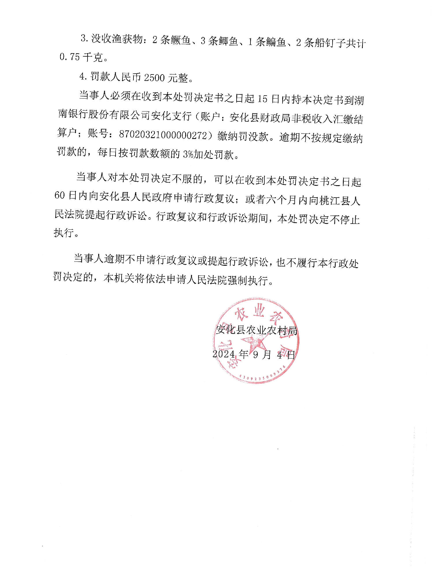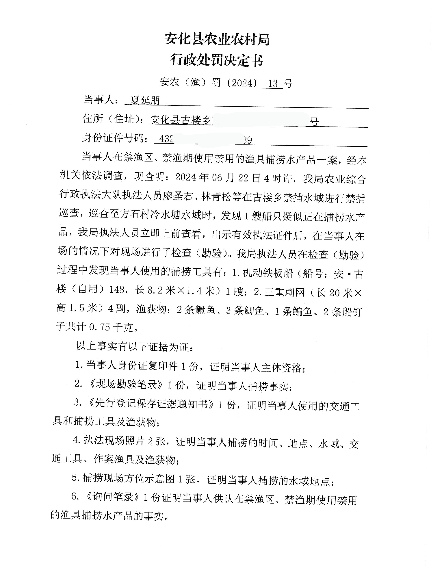 夏延朋在禁渔区、禁渔期使用禁用的渔具捕捞水产品一案行政处罚决定书 安农(渔)罚〔2024〕13号