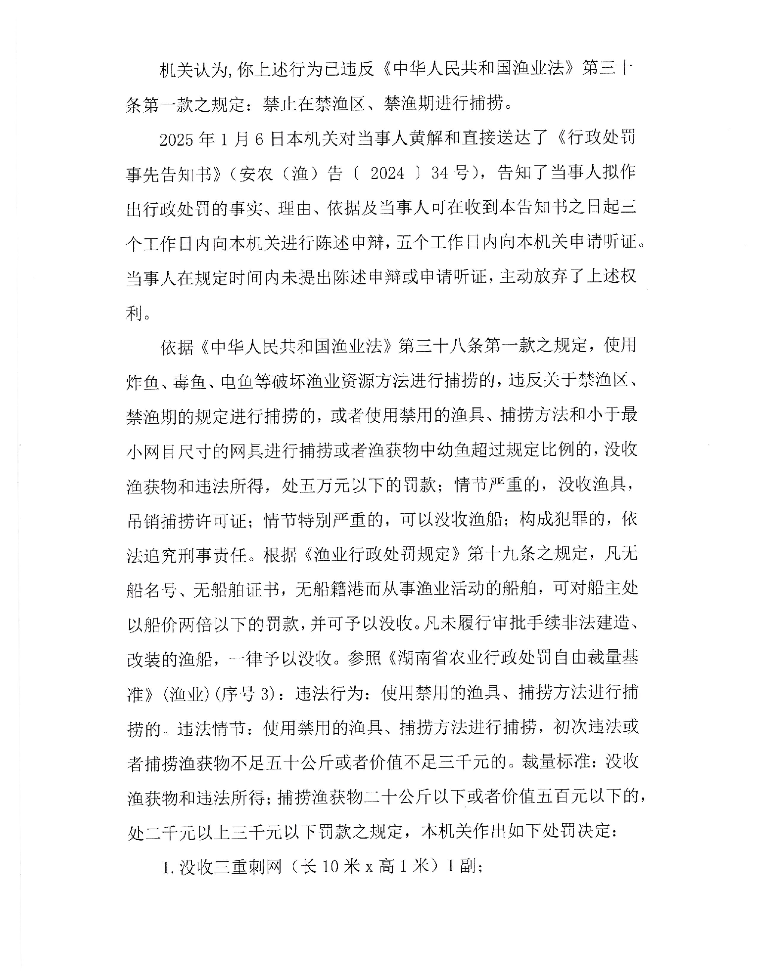黄解和在禁渔区、禁渔期使用禁用的渔具捕捞水产品一案行政处罚决定书 安农(渔)罚〔2024〕34号