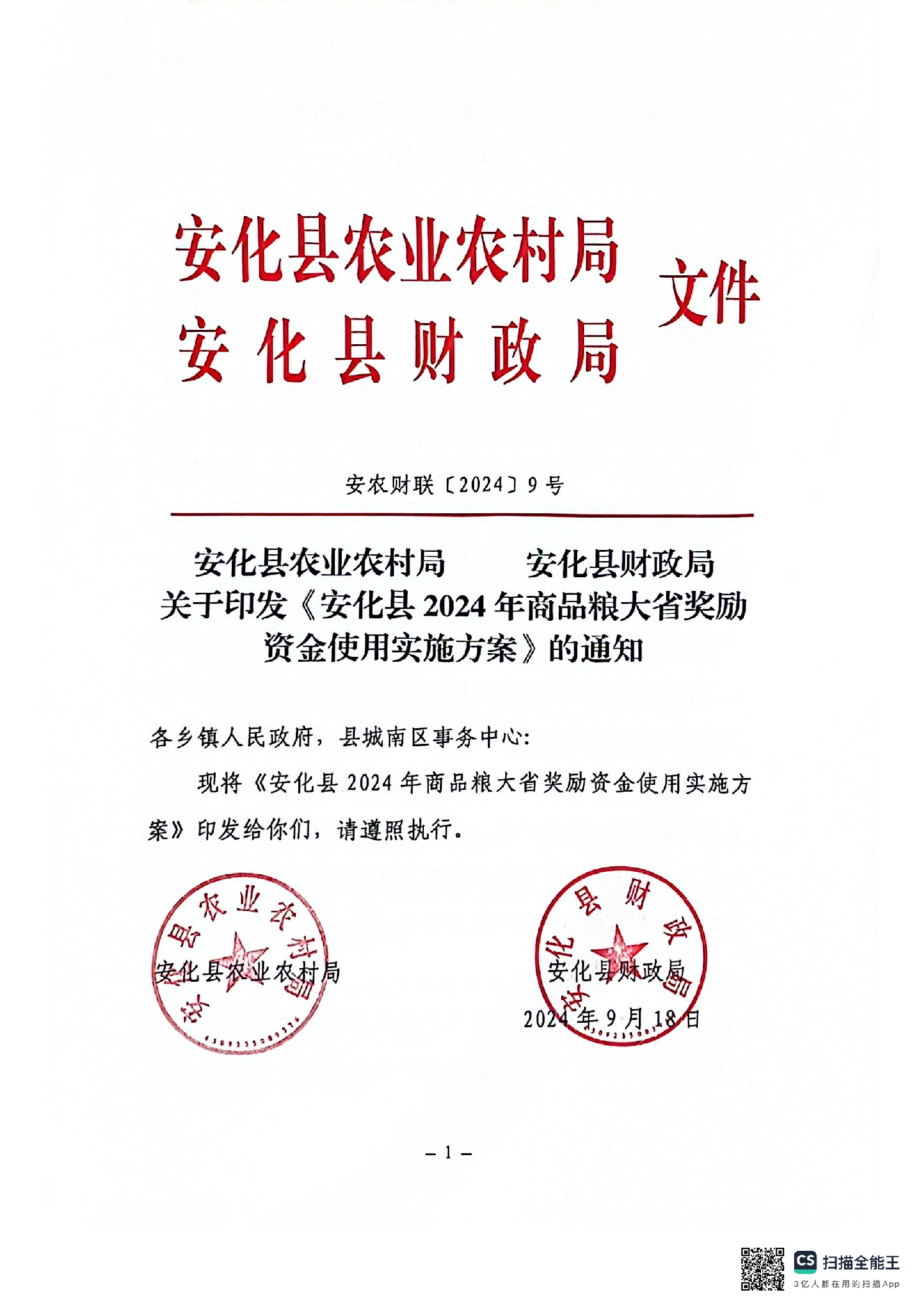 安化县农业农村局 安化县财政局关于印发《安化县2024年商品粮大省奖励资金使用实施方案》的通知