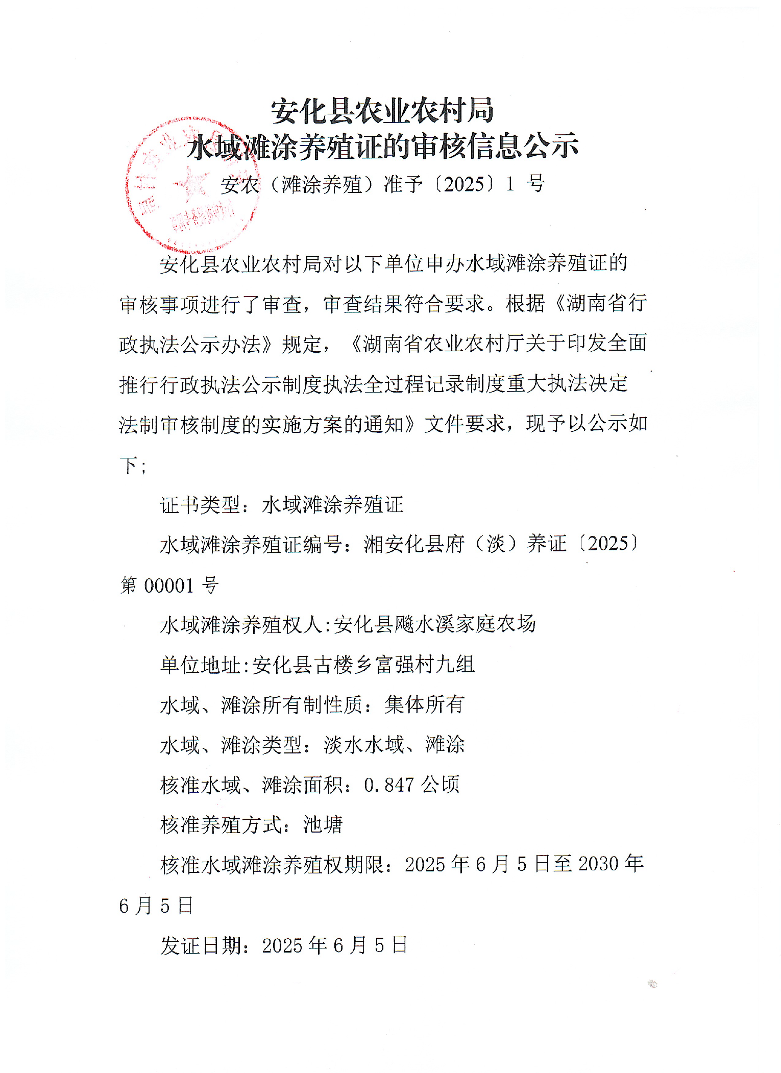 安化县农业农村局水域滩涂养殖证的审核信息公示