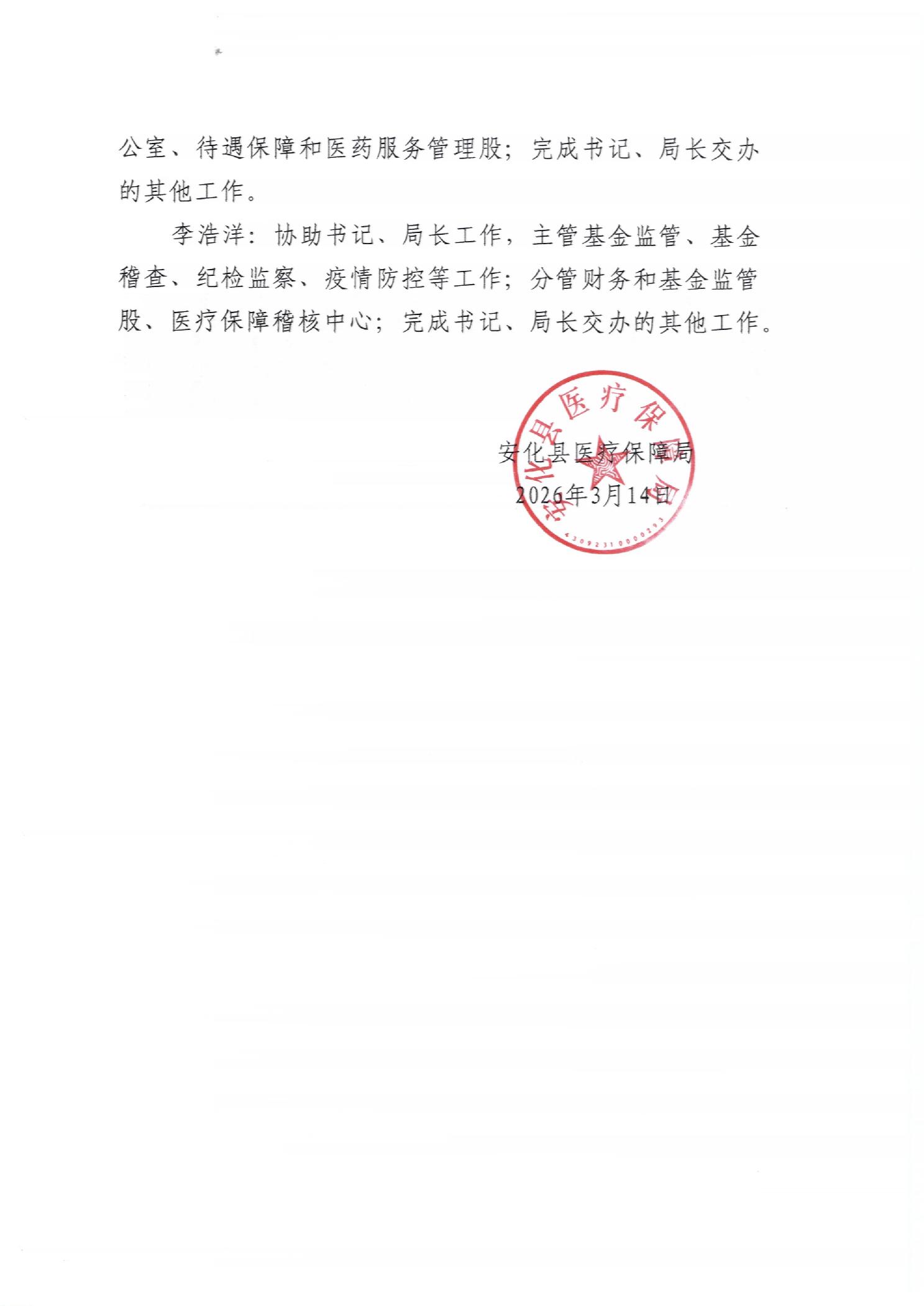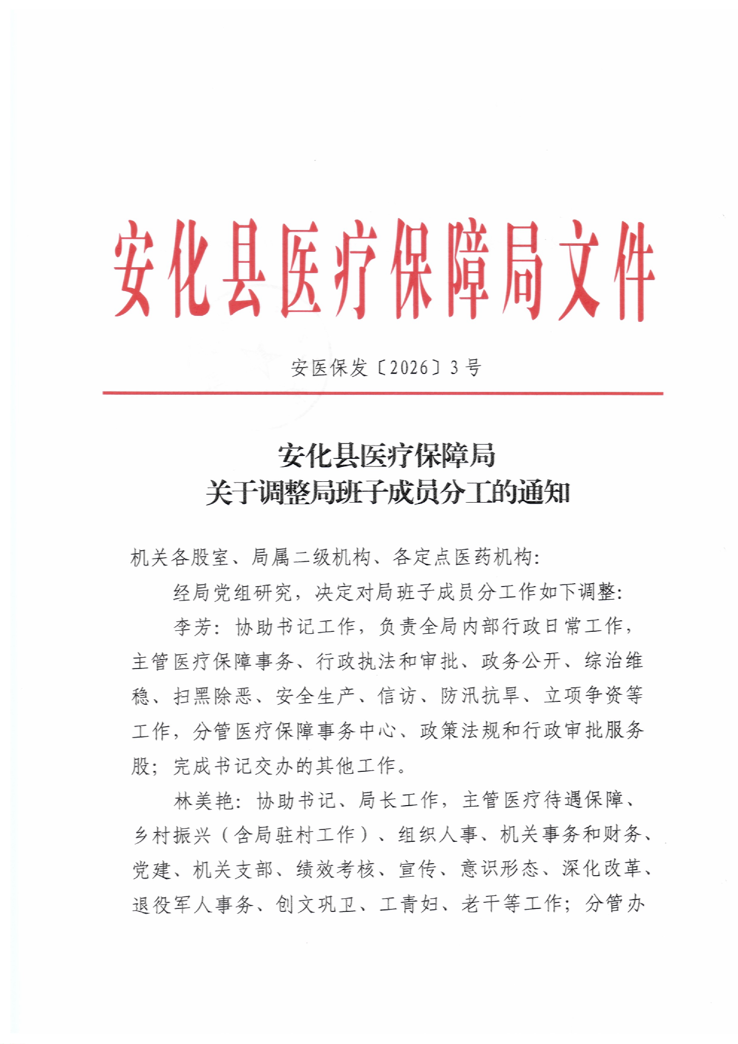 安化县医疗保障局 关于调整局班子成员分工的通知