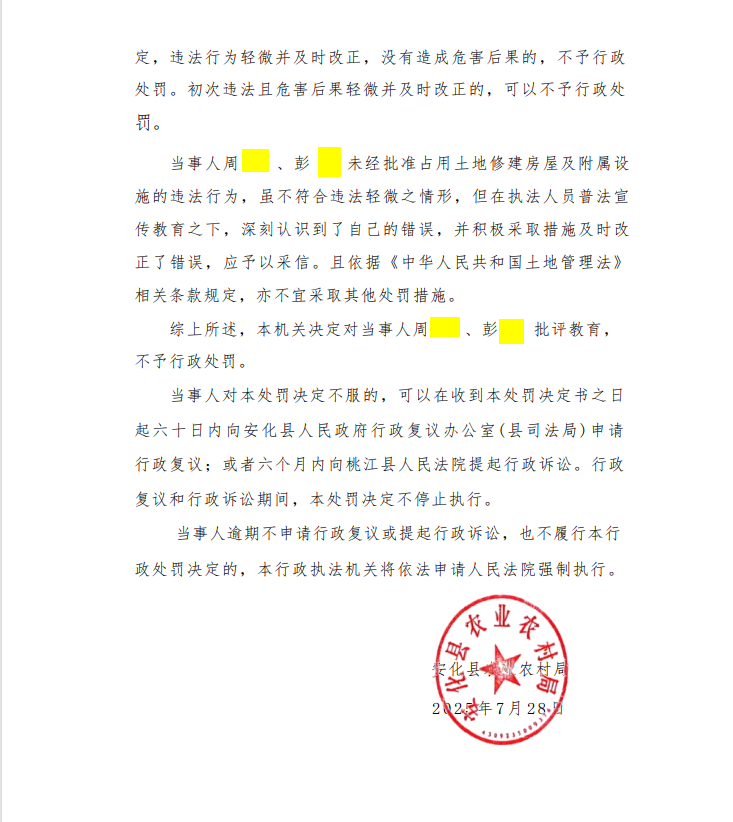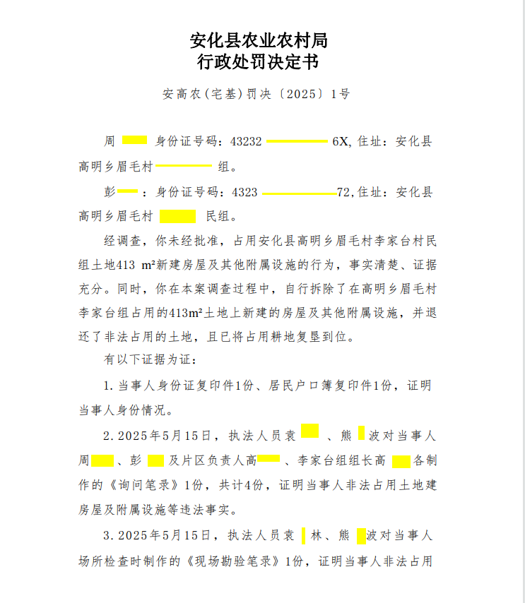 安化县农业农村局行政处罚决定书 安高农(宅基)罚决〔2025〕1号