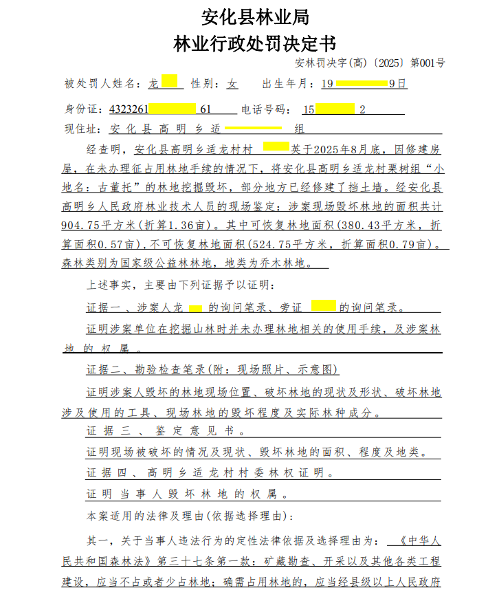 安化县林业局林业行政处罚决定书 安林罚决字(高)〔2025〕第001号