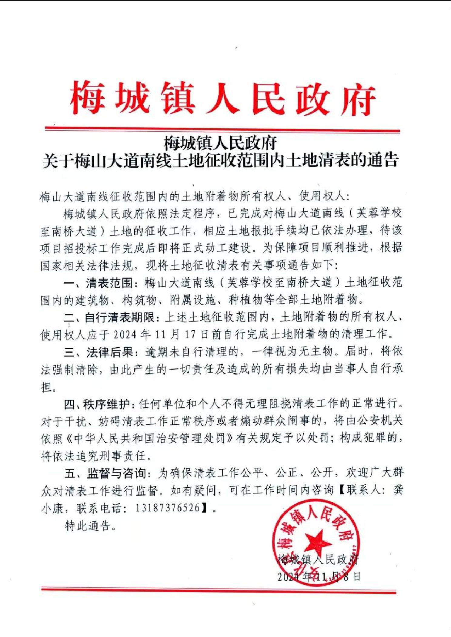 关于梅山大道南线土地征收范围内土地清表的通告