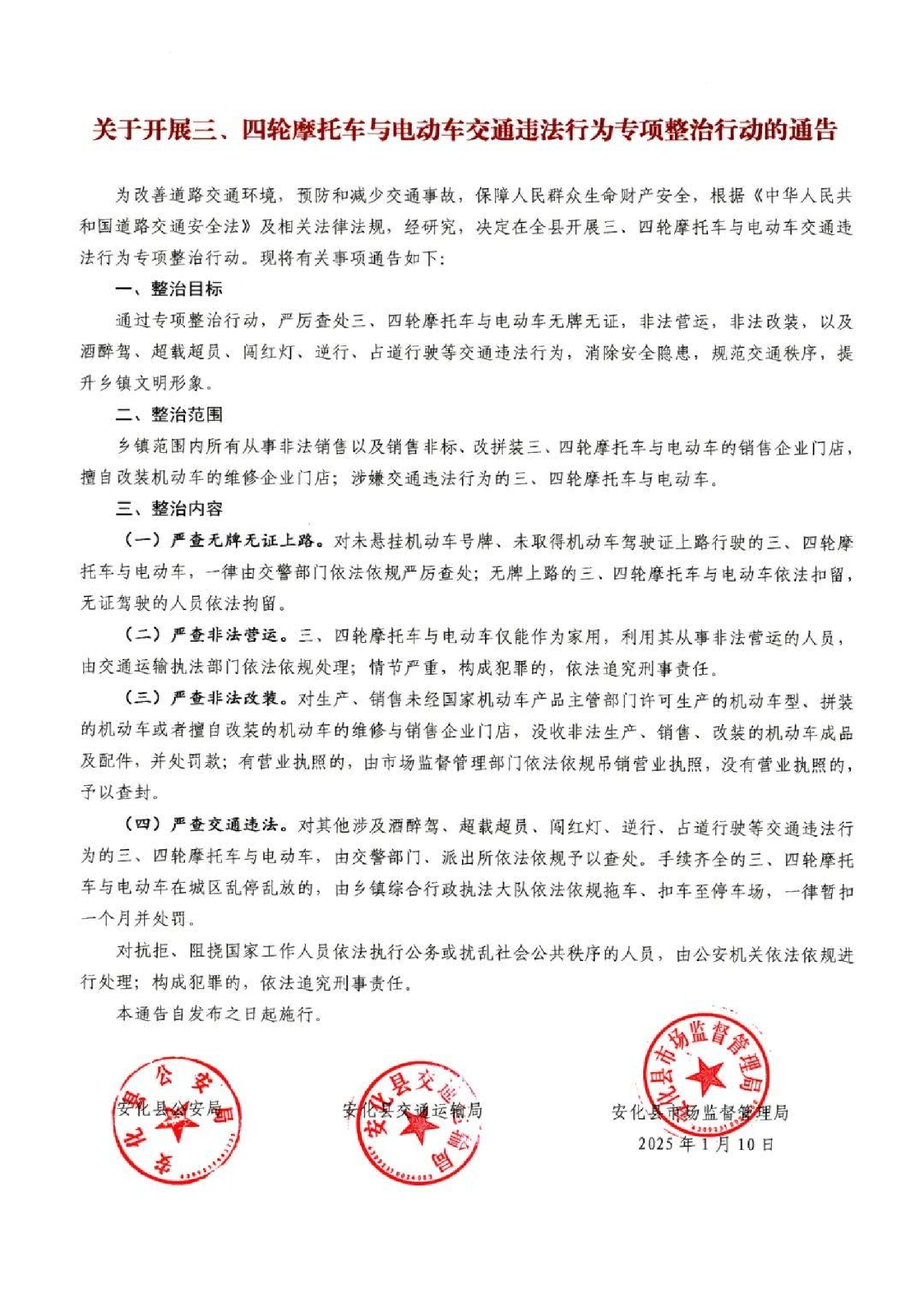 关于开展三、四轮摩托车与电动车交通违法行为专项整治行动的通告
