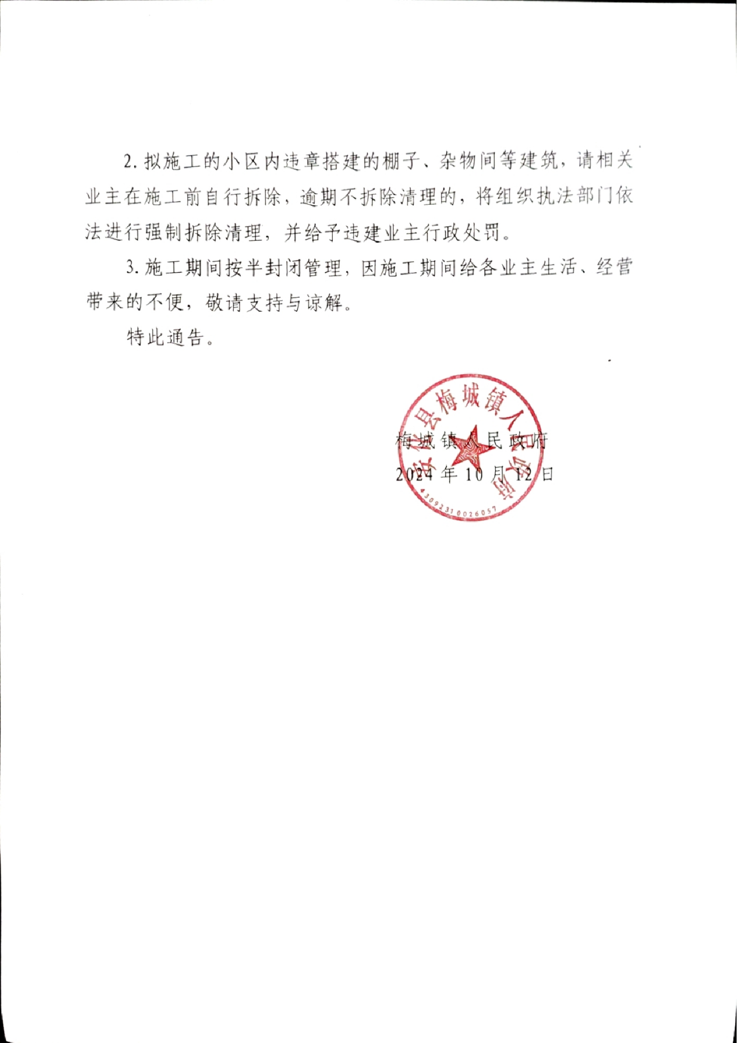 梅城镇人民政府关于梅城镇老旧小区改造工程施工相关工作的通告