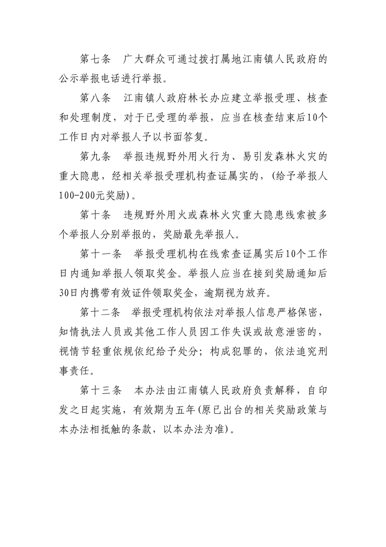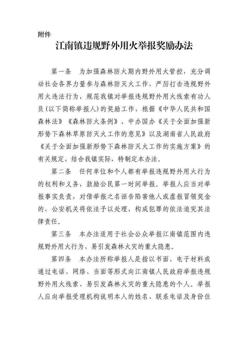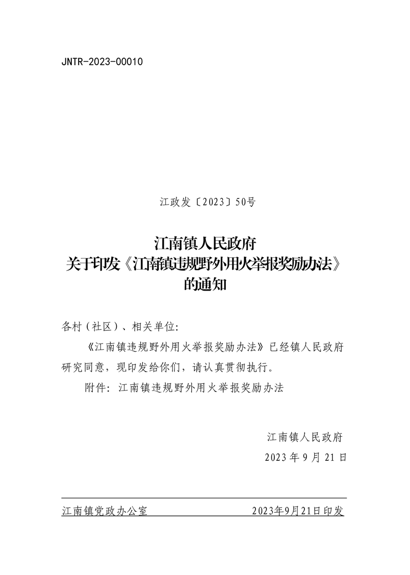 江政发〔2023〕50号关于印发《江南镇违规野外用火举报奖励办法》的通知
