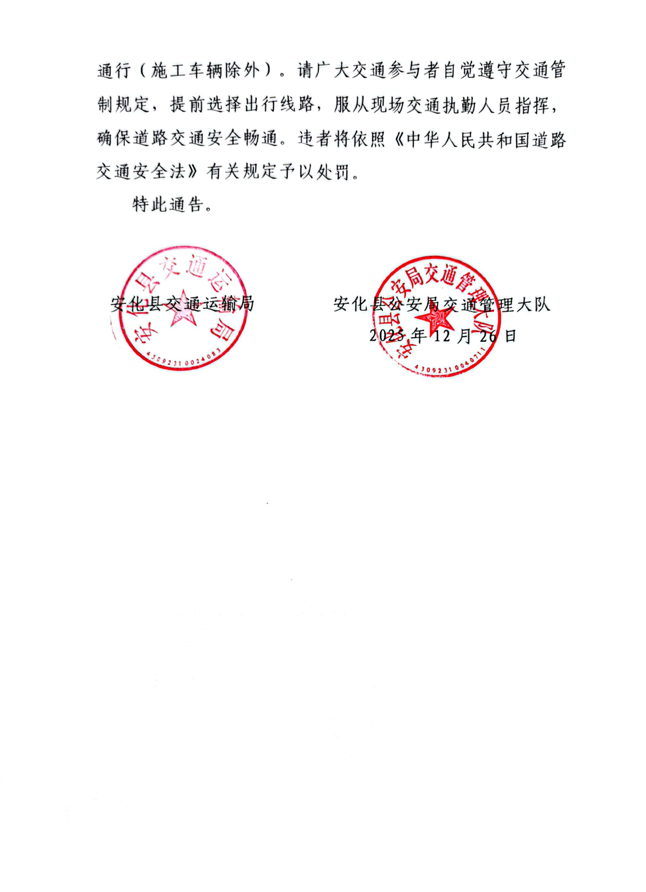 关于G536线安化县江南镇红泥村路段实施交通管制的通告
