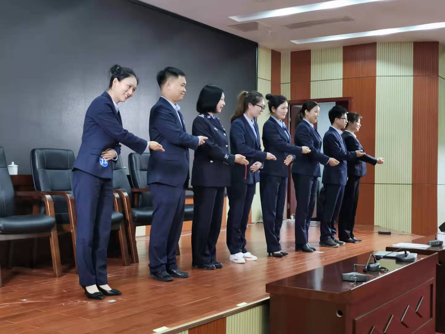 政务服务礼仪由安化县黑茶学校老师指导,短短的两个小时培训后立即进行现场比赛。我局推荐参加比赛的张跳同志在第一轮10人组情景短剧表演中脱颖而出,成为我局所在大厅的礼仪模范标兵,并进入第二轮决赛。通过展示站姿、走姿、坐姿、蹲姿以及握手等礼仪,她以扎实的礼仪基本功展现了政务人的自信、从容和优雅,受到评委的一致好评,最终在决赛获得第一名。