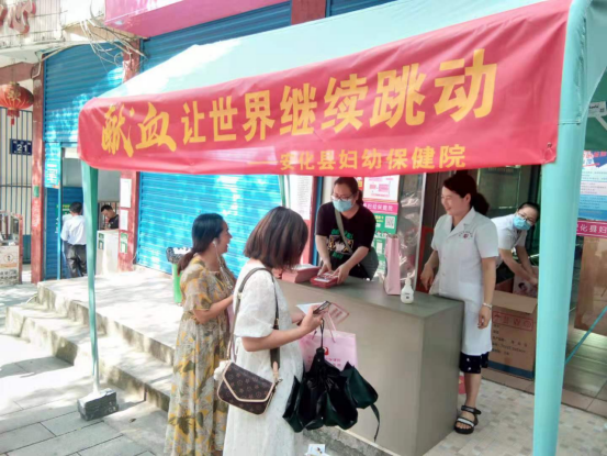 (县妇保院设置咨询台,发放无偿献血宣传资料)