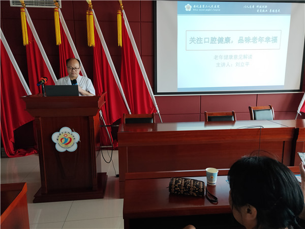 活动分为两部分,第一部分以幻灯片结合视频的形式进行讲座,内容包括常态化疫情防控的自我防护和新冠疫苗注射的相关注意事项和禁忌症、老年健康意见解读、常见老年疾病的预防与日常保健、老年人的口腔现状及特点、老年人如何进行口腔保健、牙齿缺失后的修复方式、常见口腔疾病的症状和处理方法、现场演示正确的刷牙方法等。第二部分医护人员针对口腔问题答疑解惑,并为老年人进行口腔检查,发放相关健康知识手册,赠送牙膏等口腔用品。