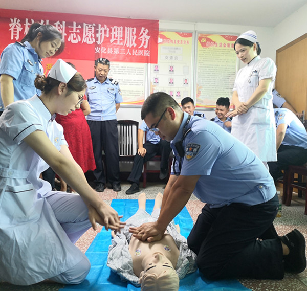 7月22日,安化县第二人民医院组织医护志愿者走进梅城镇交警大队二中队,开展急救知识培训。