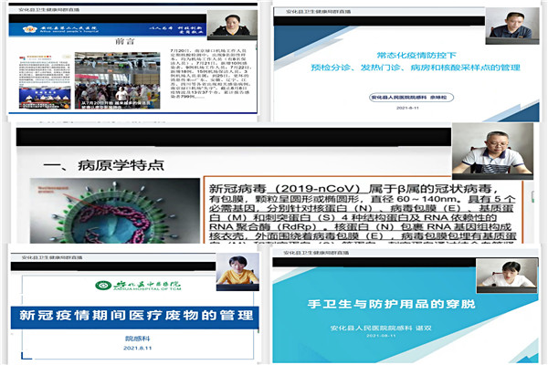 8月11日下午,我局利用线上视频直播平台举办新冠肺炎医疗救治与防控培训班。 培训班上,就《新型冠状病毒肺炎诊疗方案(试行第八版)》进行详细解读,并讲授疫情防控下预检分诊、发热门诊、病区和核酸采样点的管理;消毒隔离措施的落实和保洁员的管理;医疗废物的管理;手卫生与防护用品的穿脱等知识。 本次培训班负责人表示,本次培训旨在切实提升全县医疗机构医疗救治和院感防控能力,为进一步筑牢疫情防控防线奠定坚实基础。 参加此次培训的有县级医疗救治组专家、院感防控专家、各医疗机构业务分管院长、医务科、护理部、院感科、预检分诊、发热门诊、检验科、放射科、核酸采样、感染科、呼吸科、重症医学科、心内科、中医科、麻醉科、急诊科、隔离医学观察点等相关科室负责人等共300人。