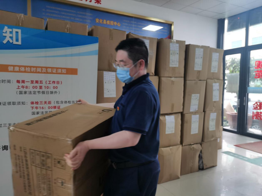 装载着满满爱心与希望的车辆驶入县疾控中心院内,建设银行安化支行负责人蒋旭东亲自带领员工和疾控工作人员共同卸运防疫物资。他说到:“由衷敬佩、感谢坚守在抗疫一线的医务工作者,我们作为企业有责任、也有义务在后方支援,尽我们的绵薄之力为防疫抗疫贡献力量。”