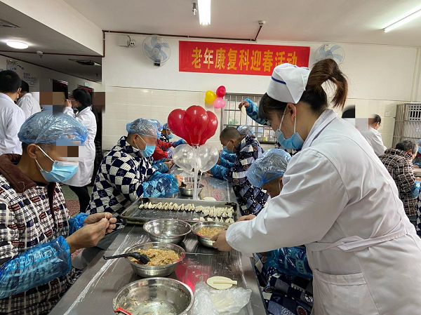 为保证活动安全有序进行,老年康复科医护人员安排布置,分工协作。活动中,他们指导患者洗净双手,佩戴口罩,陪同患者一起动手包饺子,病友们包出了各种形状的饺子,现场其乐融融,充满欢声笑语。包完饺子,病友们品尝自己的饺子,体会自己动手的喜悦,并表示,“尽管饺子的外形并不算漂亮,味道并不算顶尖,但吃在嘴上,暖在心头,感谢医护人员让我们感受到了家一般的温暖。”