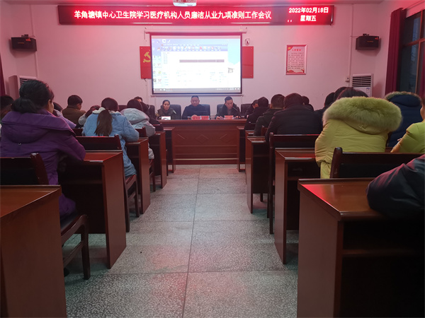 该院党支部书记强调:要通过清廉医院”建设工作,认真落实“九项准则”原则,文明行医,构建和谐的医患关系;劝阻和拒收任何人出于任何意愿或动机所送的“红包”、回扣、提成,捍卫医者的道德尊严;不过度医疗,因病施治,合理检查,合理用药;常态化落实新冠疫情防控措施,加强院感防控;严禁红白喜事大操大办。 活动还走访慰问了该院退休老党员。 羊角塘镇中心卫生院 2月18日晚,羊角塘镇中心卫生院组织全院干职工在大会议室开展《医疗机构工作人员廉洁从业九项准则》专题学习活动。 会上,该院分管副院长就《医疗机构工作人员廉洁从业九项准则》进行解读和宣讲,要求全体干职工要充分理解认识《九项准则》的重要意义,将会议精神和准则内容传达至全院每一位工作人员,做到全面覆盖、全员知晓,推动其将廉政理念内化于心,外化于行。