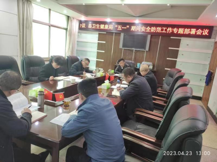 图为我局召开“五一”期间安全防范工作专题部署会 强部署,压实安全生产责任。4月19日以来,卫健系统连续召开两场会议强化部署安全生产工作,要求全系统吸取近日安全生产事故教训,严格落实安全生产主体责任,深入开展隐患排查,深化各类专项整治,强化应急值班值守,及时做好信息报送,系紧卫健工作“安全带”。同时,一把手带头深入各医疗卫生机构检查督导安全生产工作,层层传导压实责任,带头查找潜在风险隐患。