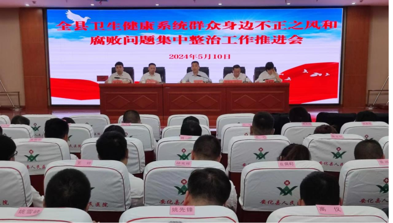 5月10日,全县卫生健康系统群众身边不正之风和腐败问题集中整治工作推进会召开。县卫健局在家党组成员,各医疗卫生单位党政主要负责人、负责党建和纪检工作的分管领导、党建专干,局机关各股室负责人、全体党员参加会议。 会上,传达了中央、省、市、县关于群众身边不正之风和腐败问题集中整治工作的相关精神,宣读《安化县卫健系统开展群众身边不正之风和腐败问题集中整治工作的实施方案》,对我县卫健系统集中整治工作进行了部署安排,并邀请县纪委常委、县监委委员李晔以《树牢规矩意识 争做遵纪守法党员》为主题,结合卫健系统的工作实际开展了专题授课。 会议指出,深入开展群众身边不正之风和腐败问题集中整治,是落实中央纪委国家监委和省市县纪委监委关于开展群众身边不正之风和腐败问题集中整治的部署要求,释放了坚决惩治群众身边“蝇贪”“蚁腐”、推动反腐败向基层延伸的鲜明信号,是提升干部作风能力、及时回应人民热切期盼的具体体现,也是推动卫健事业高质量发展的必然要求。 会议强调,要提高思想,高度重视,深刻领会中央、省、市、县部署要求,凝聚共识,充分认识集中整治工作的重要性和必要性;要迅速行动,周密部署,强化组织领导,压实主体责任,以群众“急难愁盼”问题为小切口,集中时间、集中精力、集中力量,从医疗机构内“关键少数”和关键岗位、医德医风方面、医疗质量安全、基层公共卫生服务和涉及医保基金使用等五大突出问题开展集中整治工作;要突出实效,抓好落实,结合“五医联治”、医德医风建设年行动、清廉医院建设等相关工作,统筹推进集中整治工作。全面起底问题线索,深入查找单位和个人自身存在的问题,形成问题清单、责任清单,狠抓线索处置,采取硬措施,坚决惩治群众身边腐败问题,推动集中整治走深走实;要举一反三,深入剖析,认真研究措施办法,查找问题根源,建立完善长效管理机制,着力营造卫健系统风清气正的政治生态,为推动推进高质量发展提供坚强保障。