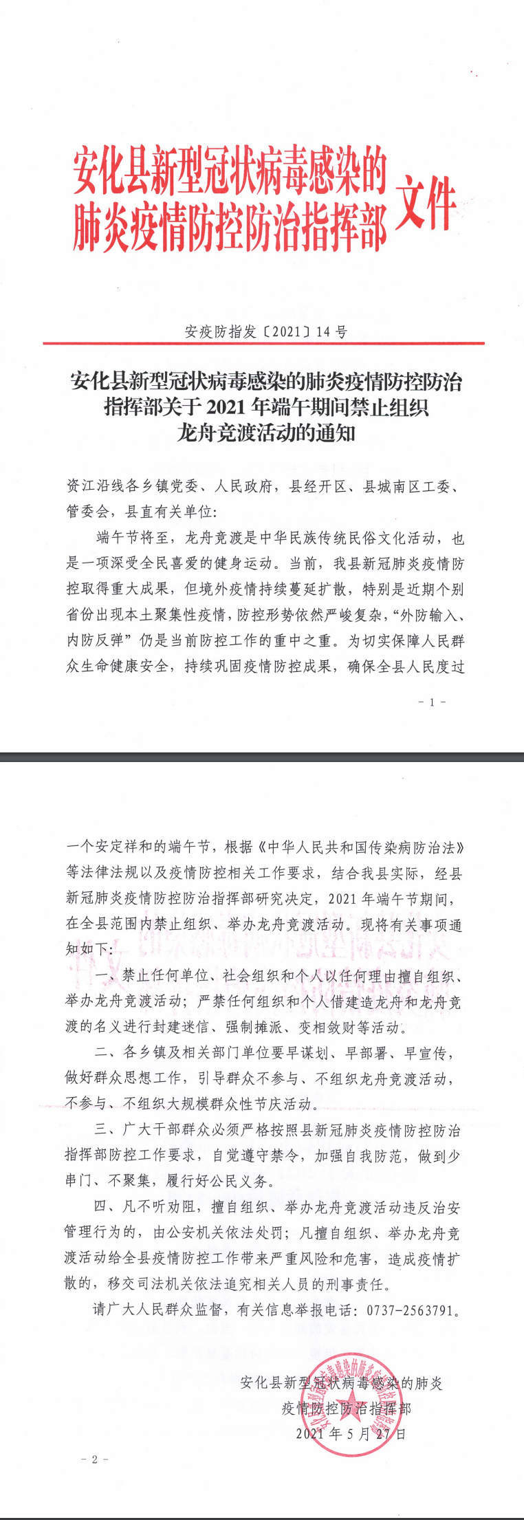 关于2021年端午节期间禁止组织龙舟竞渡活动的通知