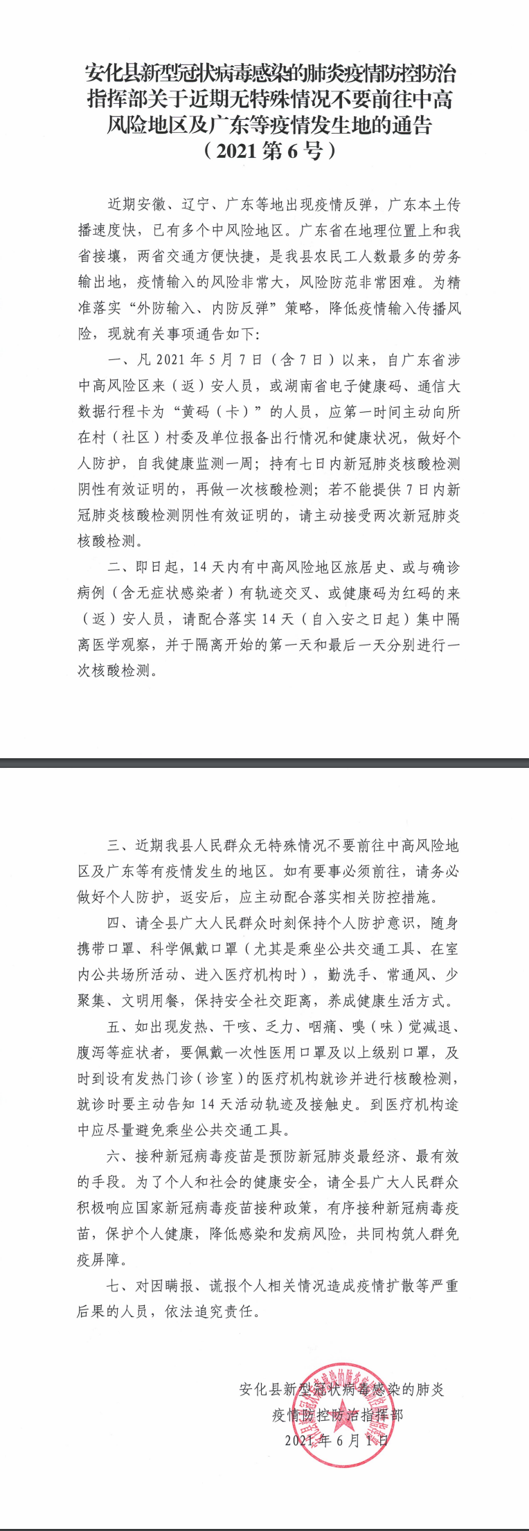 关于近期无特殊情况不要前往中高风险地区及广东等疫情发生地的通告(2021第6号)