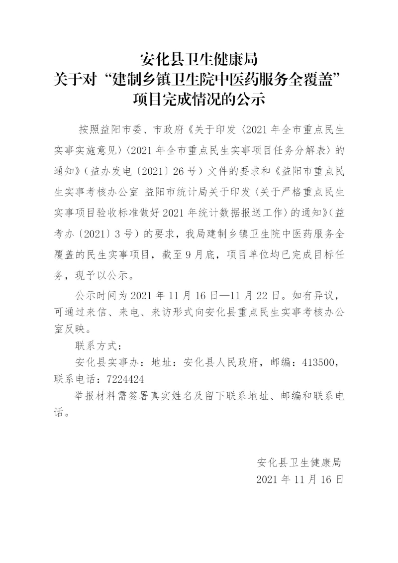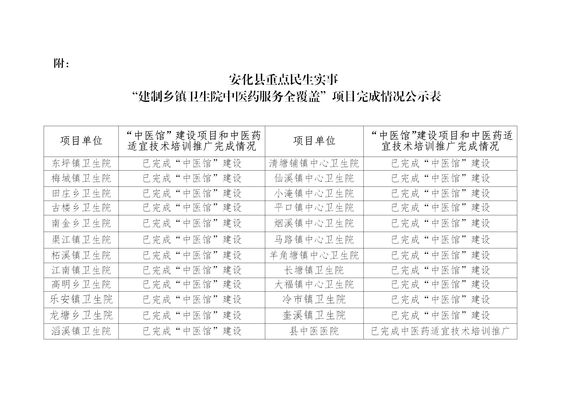 安化县卫生健康局关于对“建制乡镇卫生院中医药服务全覆盖”项目完成情况的公示