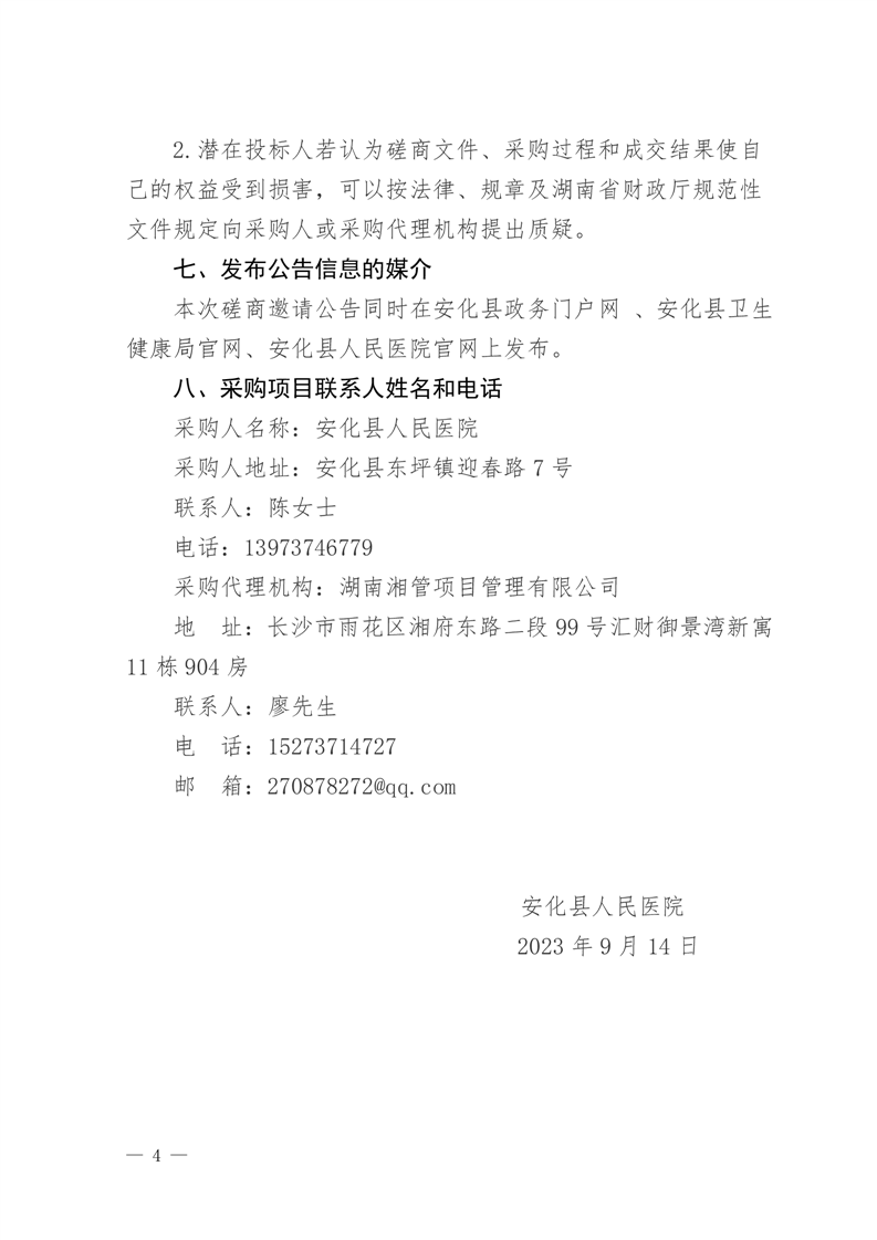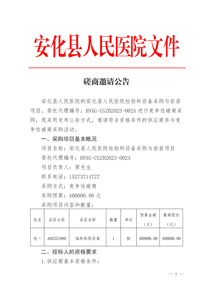 安化县人民医院检验科设备采购与安装项目磋商邀请公告