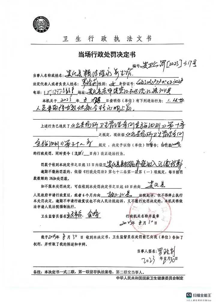 当场行政处罚决定书(安化县精洁理疗养生馆)