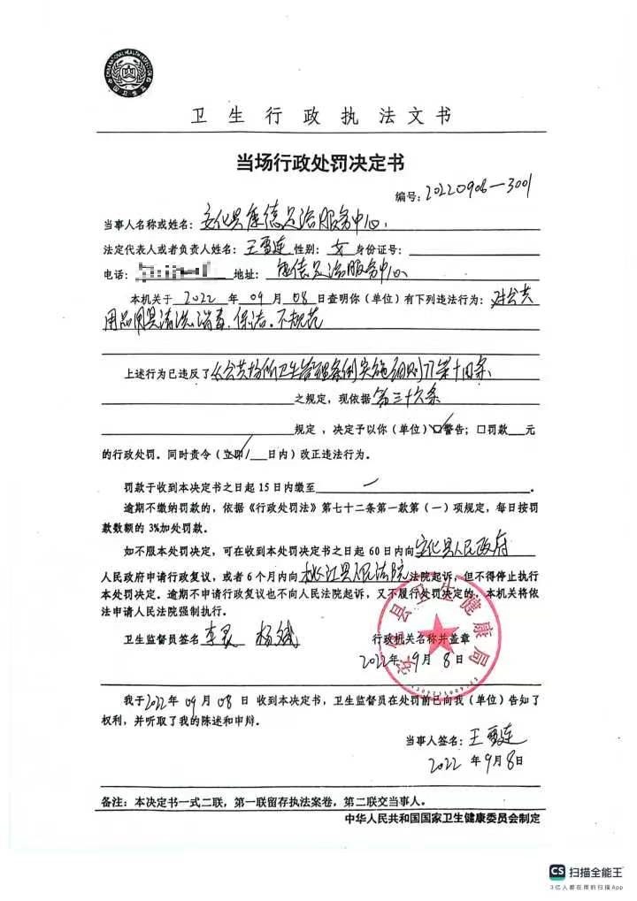 当场行政处罚决定书(安化县康德足浴服务中心)