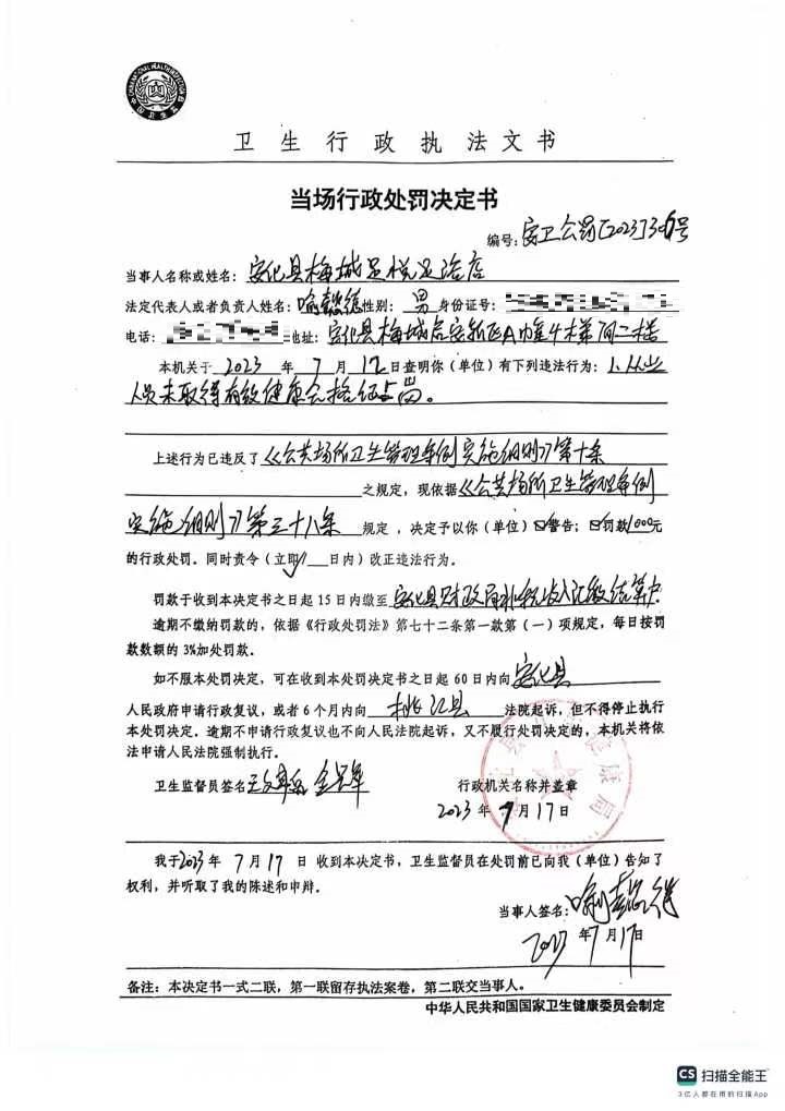 当场行政处罚决定书(梅城镇足悦足浴店)