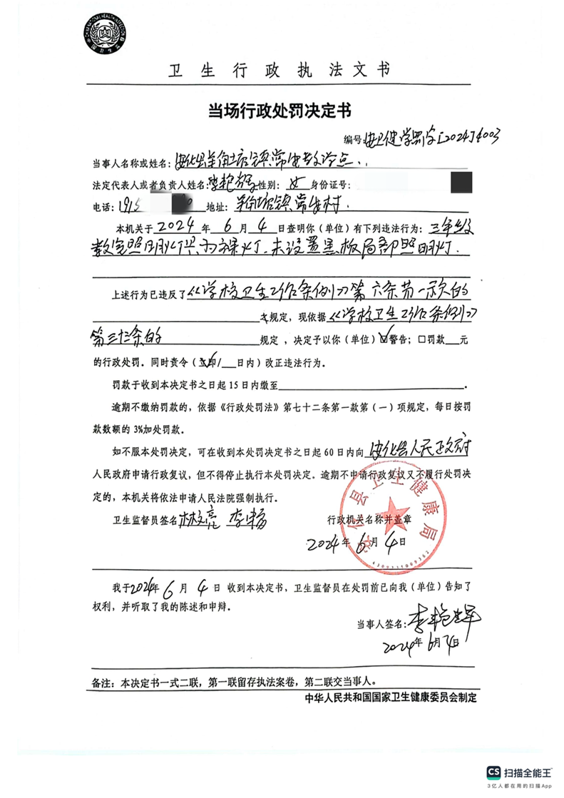 当场行政处罚决定书(羊角塘镇常安教学点)
