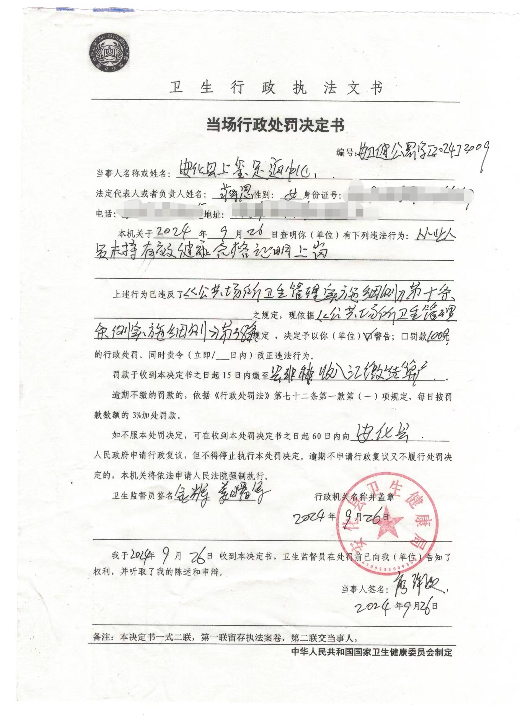 当场行政处罚决定书(上玺足道中心)
