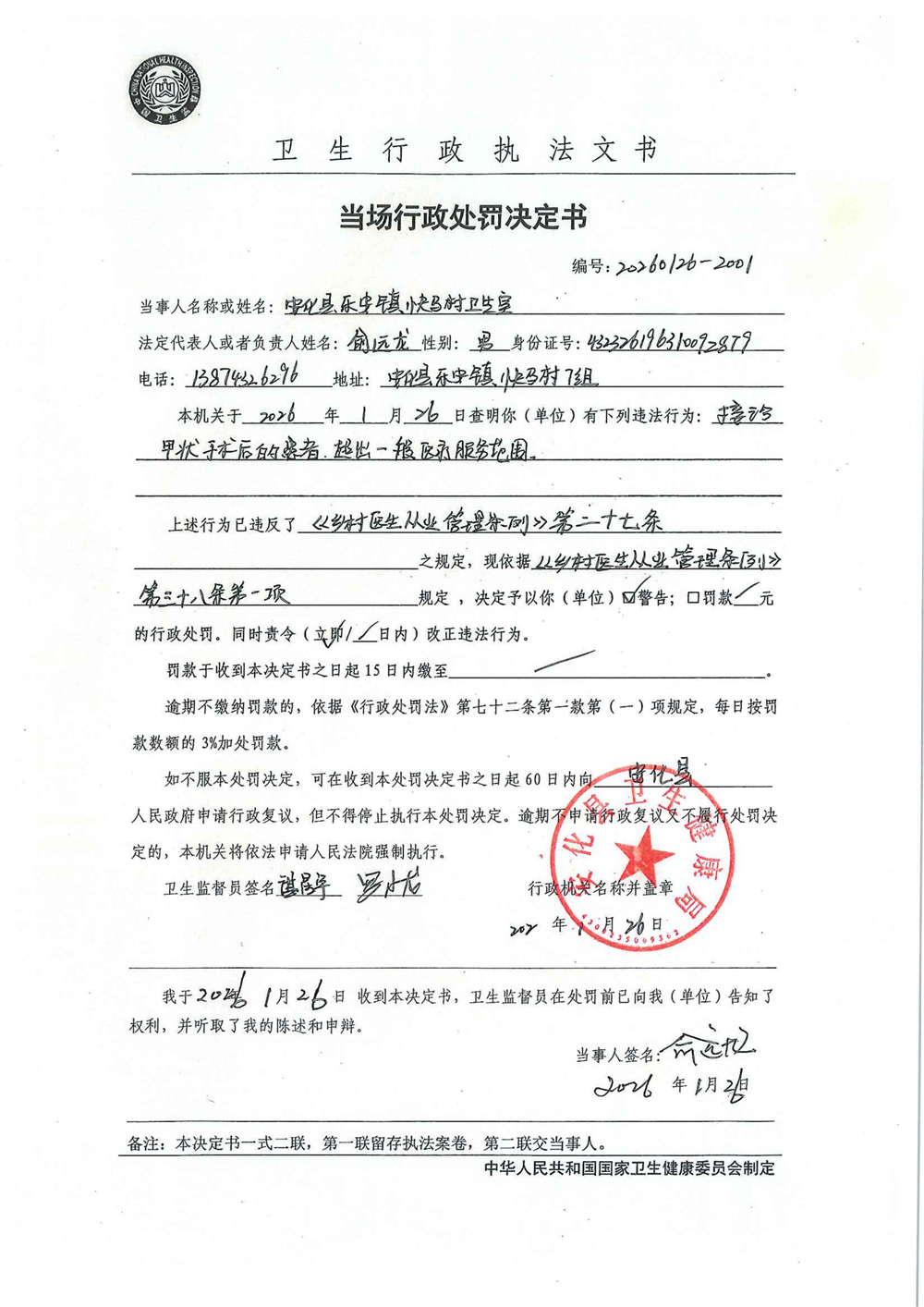当场行政处罚决定书(安化县乐安镇快马村卫生室)