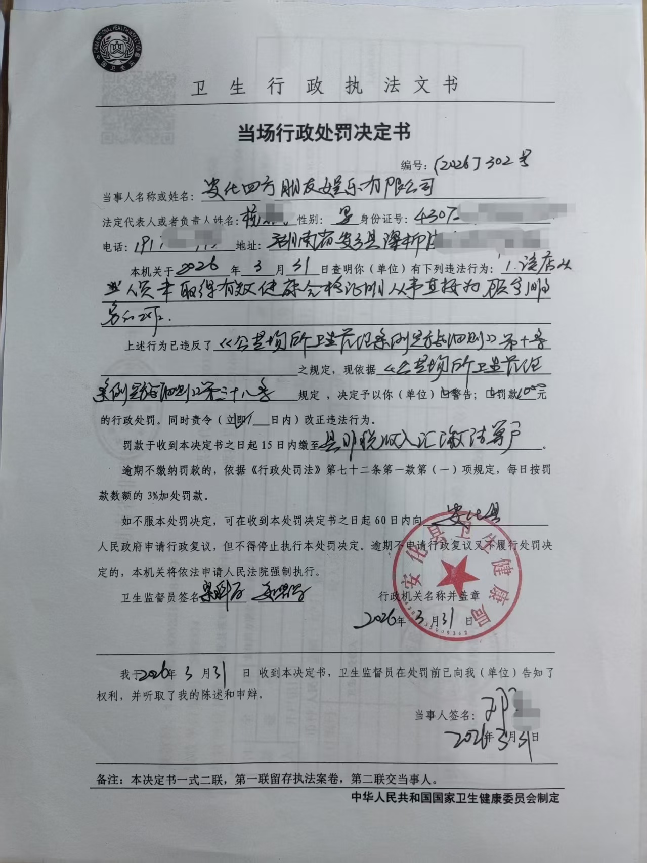 当场行政处罚决定书(安化四方朋友娱乐有限公司)