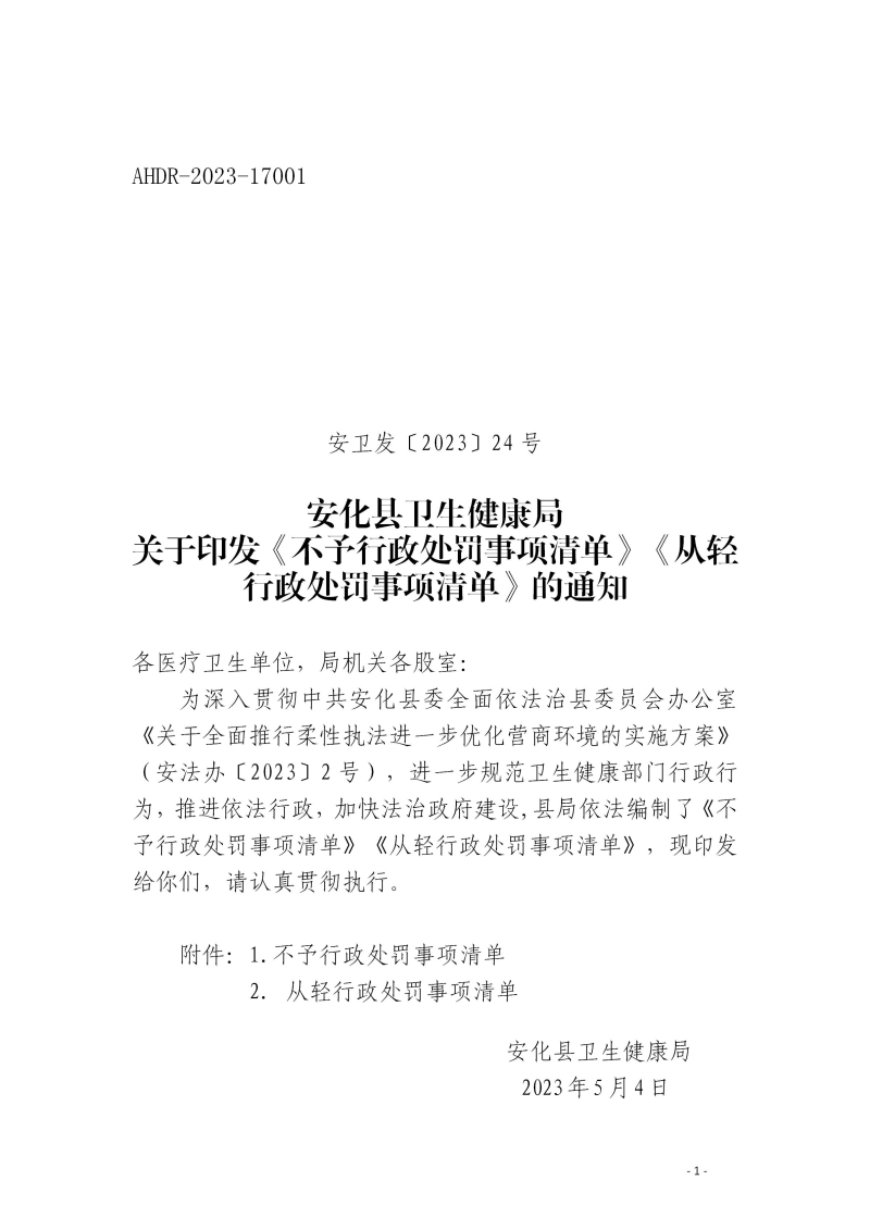 安化县卫生健康局关于印发《不予行政处罚事项清单》《从轻行政处罚事项清单》的通知