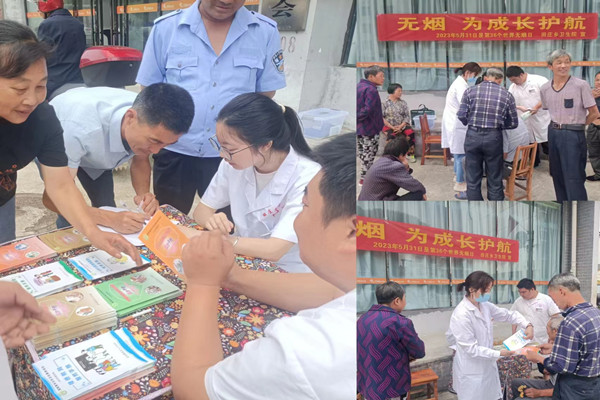 县疾控中心 5月31日,县疾控中心在县城迎宾路开展“无烟 为成长护航”为主题的宣传活动。 工作人员通过悬挂主题横幅、摆放宣传展架、设立咨询台、发放宣传资料等形式,向过往群众宣传吸烟及二手烟暴露危害,深入普及电子烟危害知识,引导吸烟者主动戒烟、非吸烟者勇于拒绝二手烟,呼吁大家为了自身和下一代的健康,减少烟草对青少年带来的危害,营造浓厚控烟社会氛围。活动共发放宣传资料500余份,接受群众咨询近100人次,提高了群众对烟草威胁青少年成长的认识,进一步巩固加强了控烟、戒烟的工作成果。 田庄乡卫生院 5月29日上午,田庄乡卫生院联合文溪社区卫生室在文溪社区居委开展了控烟宣传活动。