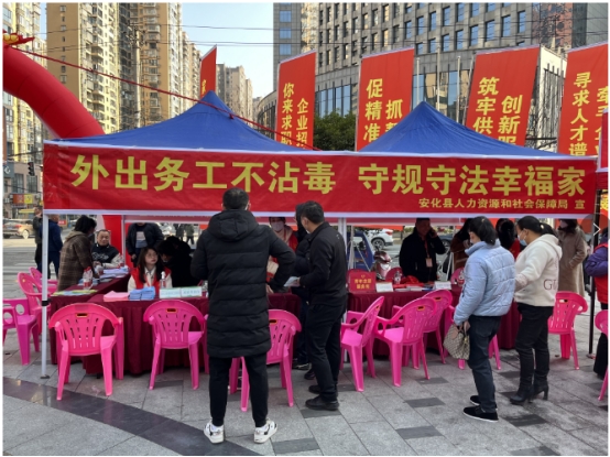 为提高外出务工群众的禁毒意识和识毒、防毒能力,1月31日,安化县人社局以“春风行动”招聘会活动为契机,在恒太城广场前坪开展禁毒宣传活动。
