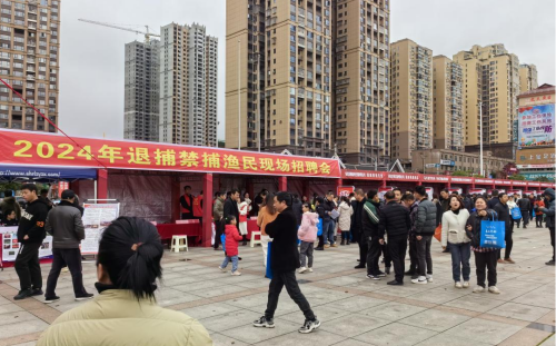 3月1日,安化县“春风行动”现场招聘会在资江河畔的平口镇举行。此次参与招聘会活动的企业共20家,到场求职的退捕渔民68人。