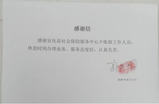 2024年8月3日下午,一封按了红手印的感谢信被办事群众悄悄放在了安化社保中心办事大厅转移窗口上。上面写着“感谢安化县社会保险服务中心个账股工作人员,休息时间办理业务。服务态度好,认真负责。”这短短的一封感谢信,折射出了基层社保人为民服务的热心、细心和耐心。 8月3日中午12点30,正是政务中心窗口工作人员休息的时候,大家抓紧时间小憩片刻,为下午的紧张忙碌工作养精蓄锐。就在这时,郭先生来到了办事大厅,走到社保中心个账股的窗口前咨询政策。 原来,在外工作多年的郭先生今年决定回家乡发展,得知养老保险可以转移,特意从外地赶回安化,准备把省外缴纳的养老保险转移回来。相关工作人员迅速进入工作状态,第一时间了解郭先生诉求,用通俗易懂的语言解释政策、告知转移手续办理的流程,查阅档案、录入数据,经过近一小时有条不紊的处理,郭先生的转移手续已成功办结。 郭先生对她们的付出看在眼里,暖在心里。“真的太感谢她们了,本来还担心午休时间办不了事,我家又离得远,来一趟不容易,没想到她们主动加班为我们服务,真的很贴心,我一定要写一封感谢信,来谢谢社保中心的工作人员为我排忧解难!”他感慨地说道。 这正是安化县社保中心服务为民的真实体现。近年来,安化社保中心以“社会保险大抓落实”工作为契机,推进民生可感、可及,进一步提升服务质效。只要群众来到窗口,工作人员就秉承着“一到即办”“最多跑一次”的理念站好每一班岗。他们用实际行动诠释了“以人民为中心”的服务理念,用自己的辛勤付出为群众搭建起一座坚实的社会保障桥梁,展现了新时代基层社保人的责任与担当,更赢得了群众的高度认可和赞誉。 在未来的工作中,社保中心将继续秉持为民精神、奉献精神,不断提升服务质量,为群众提供更加优质、高效的社保服务,为构建和谐社会贡献社保力量,进一步增强安化广大参保群众的获得感、幸福感、安全感。 初审初校:李 艳 复审复校:刘书谋 终审终校:刘少岩